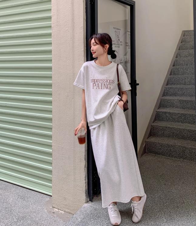 對於不懂搭配的姐妹來說,套裝可是最方便的,這一套t恤和半身長裙的組合,舒適又顯瘦,與運動鞋的搭配,整體看起來休閒感爆棚。高腰款式的半身長裙,裙子長度恰到好處,就算是小個子女生也能輕鬆駕馭。
