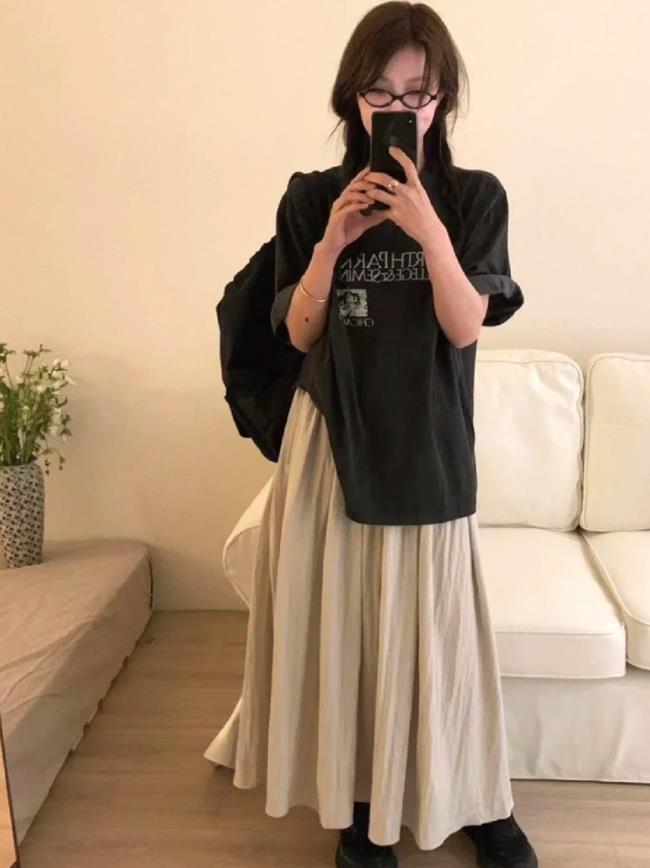 鬆弛慵懶感的穿搭,實在是太愛了,整體的風格有些偏韓系簡約範,喜歡這種風格的姐妹就是要試試。菸灰色的t恤,沒有黑色那麼顯沉悶,與杏色半身長裙組合,也太好看了吧,這種慵懶隨意的搭配,對身材是完全沒有約束感的。