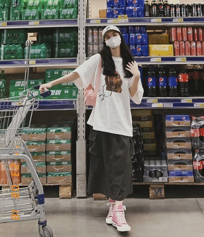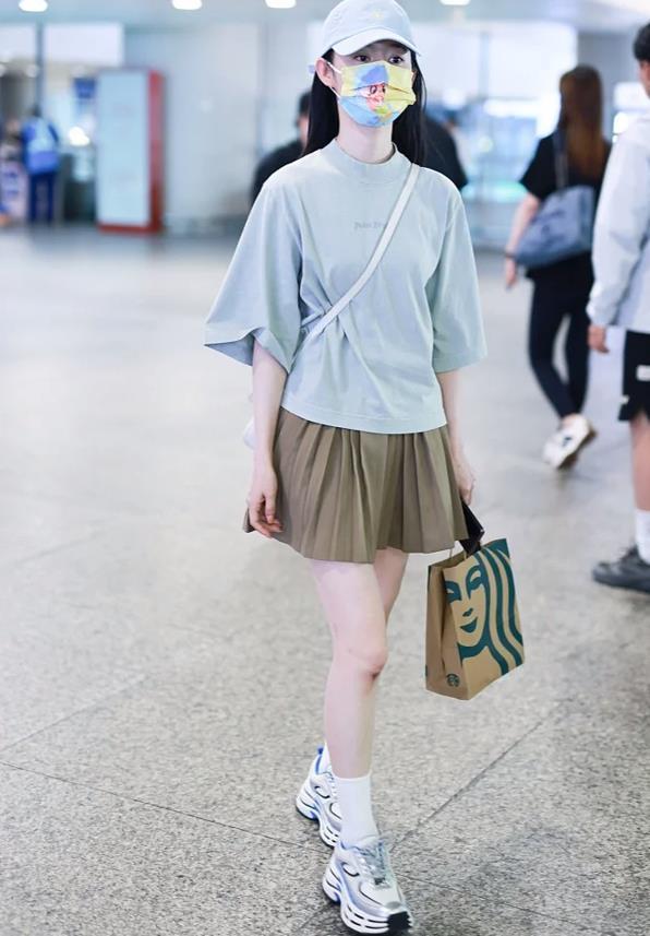 郭曉婷這一套t恤+半身裙的搭配,也太時尚和清爽了,淺藍色的短袖t恤,這個顏色很襯膚色和顯白,搭配咖啡色百褶短裙,加上一雙運動鞋,還有利用起棒球帽進行點綴,一整個青春少女範的氛圍感,夏天出街或者是度假都可以這麼穿。
