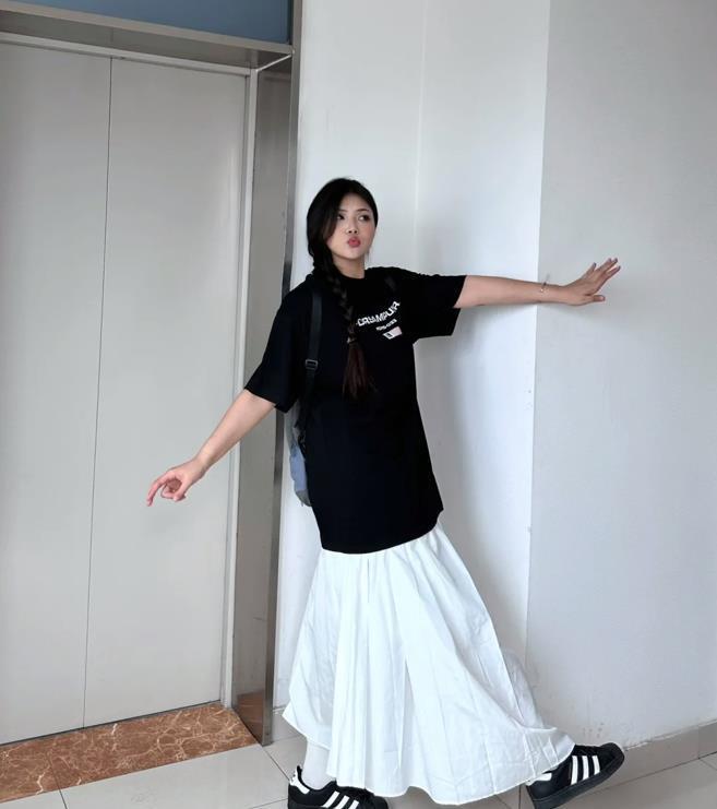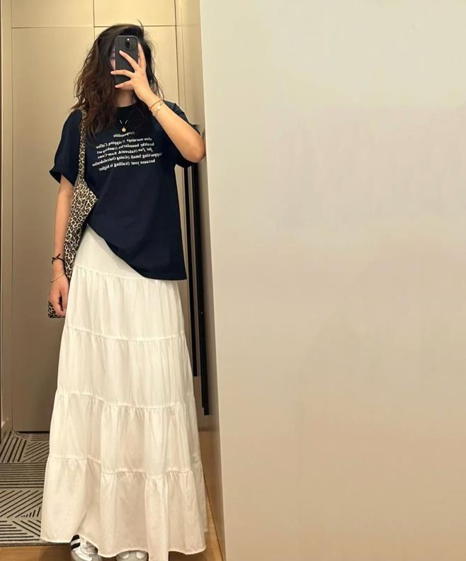 真的很喜歡黑白配的穿搭,這麼穿也太時髦和高級了,黑色寬鬆t恤,可是自帶休閒和舒適感的,選擇白色半身長裙相配,也太仙氣十足了,裙子的版型是a字形狀的,可藏肉顯瘦了,長度和版型都很正,胖女生也可以穿得很瘦。