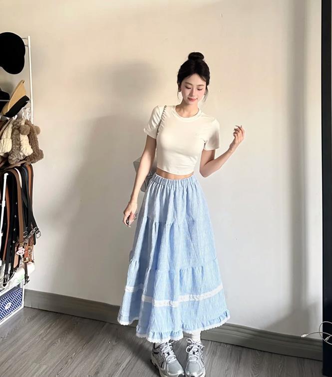 藍白配色的穿搭,真的太適合夏天了,一整個被清爽住了,正肩短袖t恤,可以很好修飾你的上身比例,與藍色半身長裙相配,a字版型的裙子,把腰襯托得很纖細,也藏肉顯瘦。頗有少女範的一套。