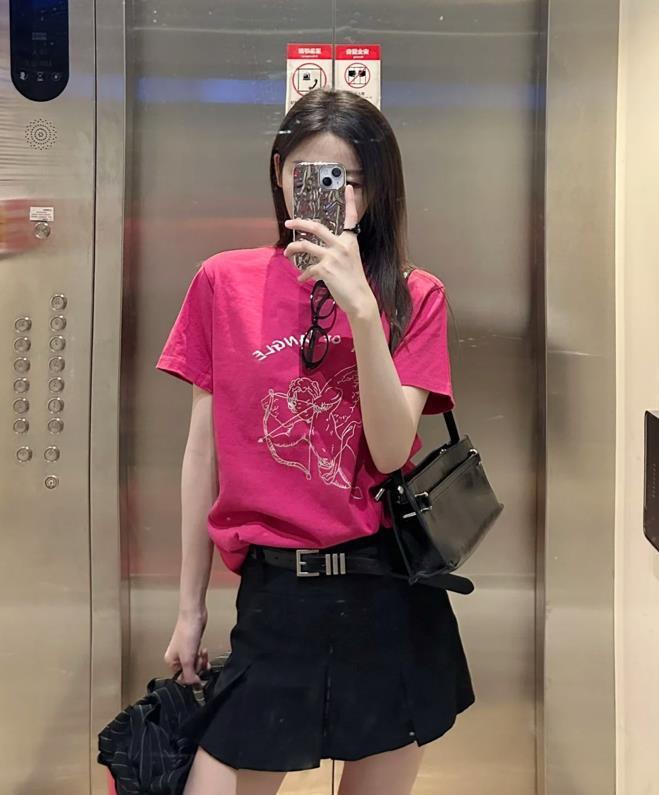 夏天就是要大膽嘗試下明亮色調的衣服,這件火龍果色t恤穿起來有多顯白,想必也不用多說了吧?寬鬆的版型加持下,很藏肉顯瘦,下裝配一條黑色百褶西裝短裙,這麼穿也太顯瘦了。