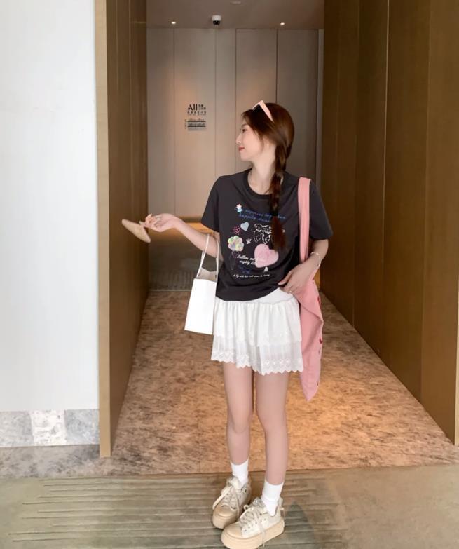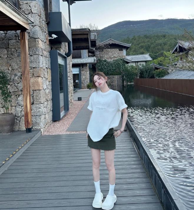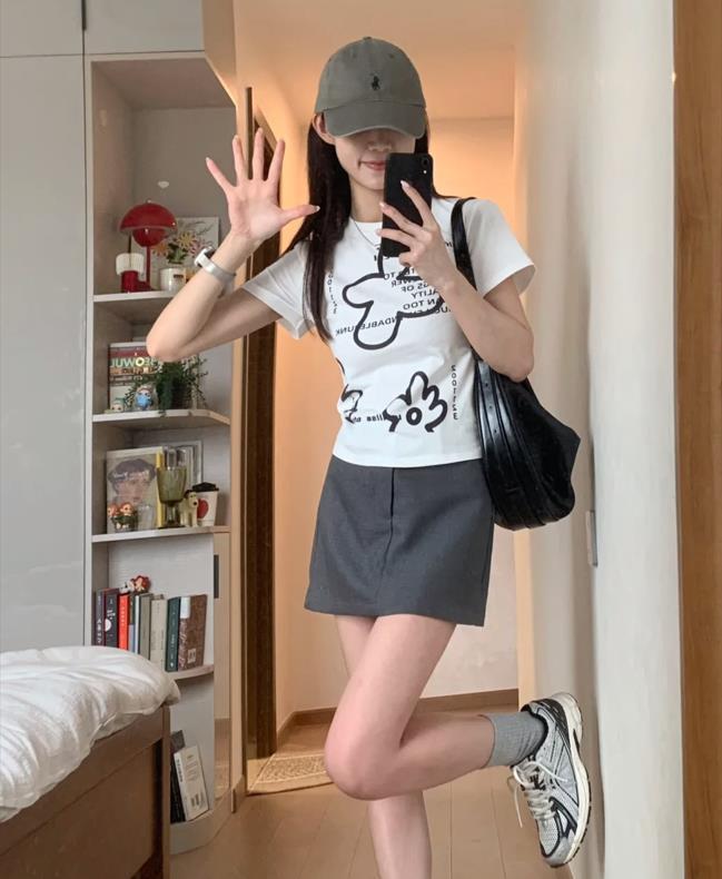 很適合小個子女生的一套穿搭,這麼一整套看起來也太清爽涼快了,短款的t恤+灰色半身短裙,150小個子也可以穿出160的既視感。再搭配上一雙運動鞋,利用襪子外露製造出層次感,很好豐富了整個着裝。