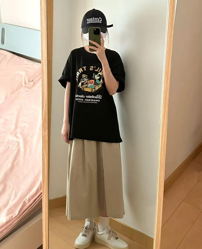 鬆弛感的穿搭,今年實在太流行了,這個夏天,當你不知道該怎麼穿搭時,就試試鬆弛感的搭配吧,隨性慵懶又舒適,大版型的t恤和卡其色半身長裙,上下裝都是寬鬆的款式,也太藏肉顯瘦了,最重要的是不挑身材。