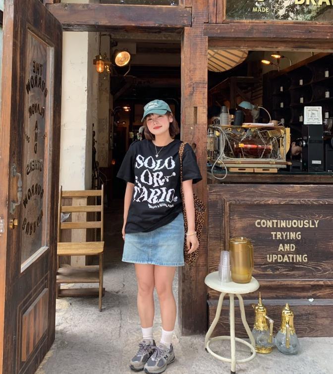 黑色字母t恤,自帶一種休閒和趣味性,比起純色款,這種增加了字母元素的t恤,可太好看了,選擇一條牛仔半身短裙來配,青春少女範十足。鞋子選擇運動鞋來配就可以,增加休閒氣息和舒適度。