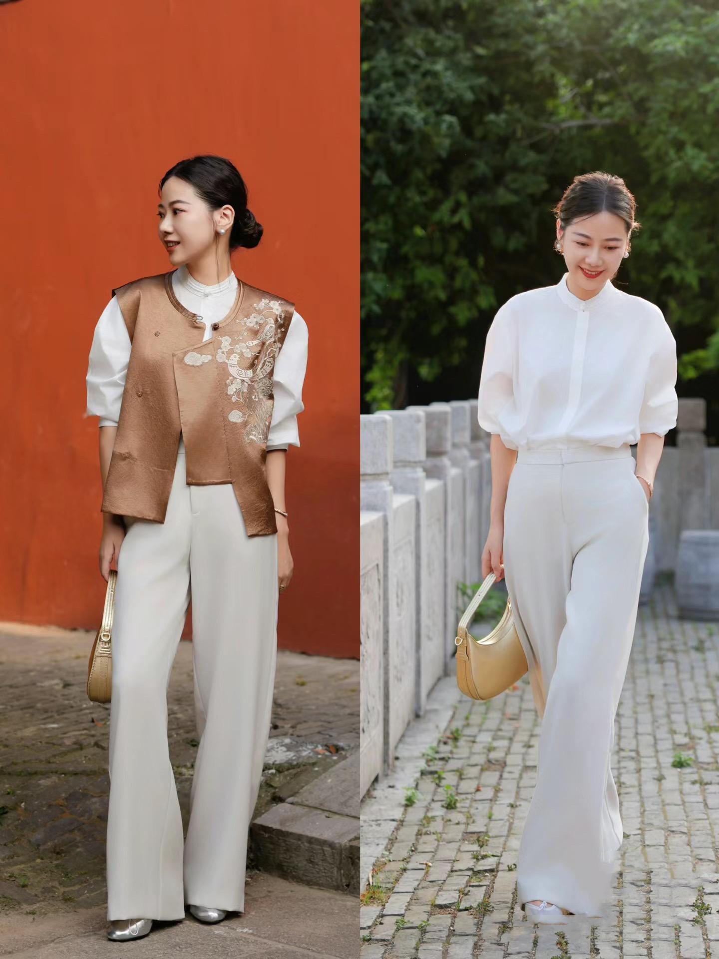我們只需要稍微挽起衣袖,就可以露出手臂線條、塑造出更輕盈時尚的美。這種白襯衫+白色西裝褲的搭配,乾淨、清爽,擁有着無限魅力。