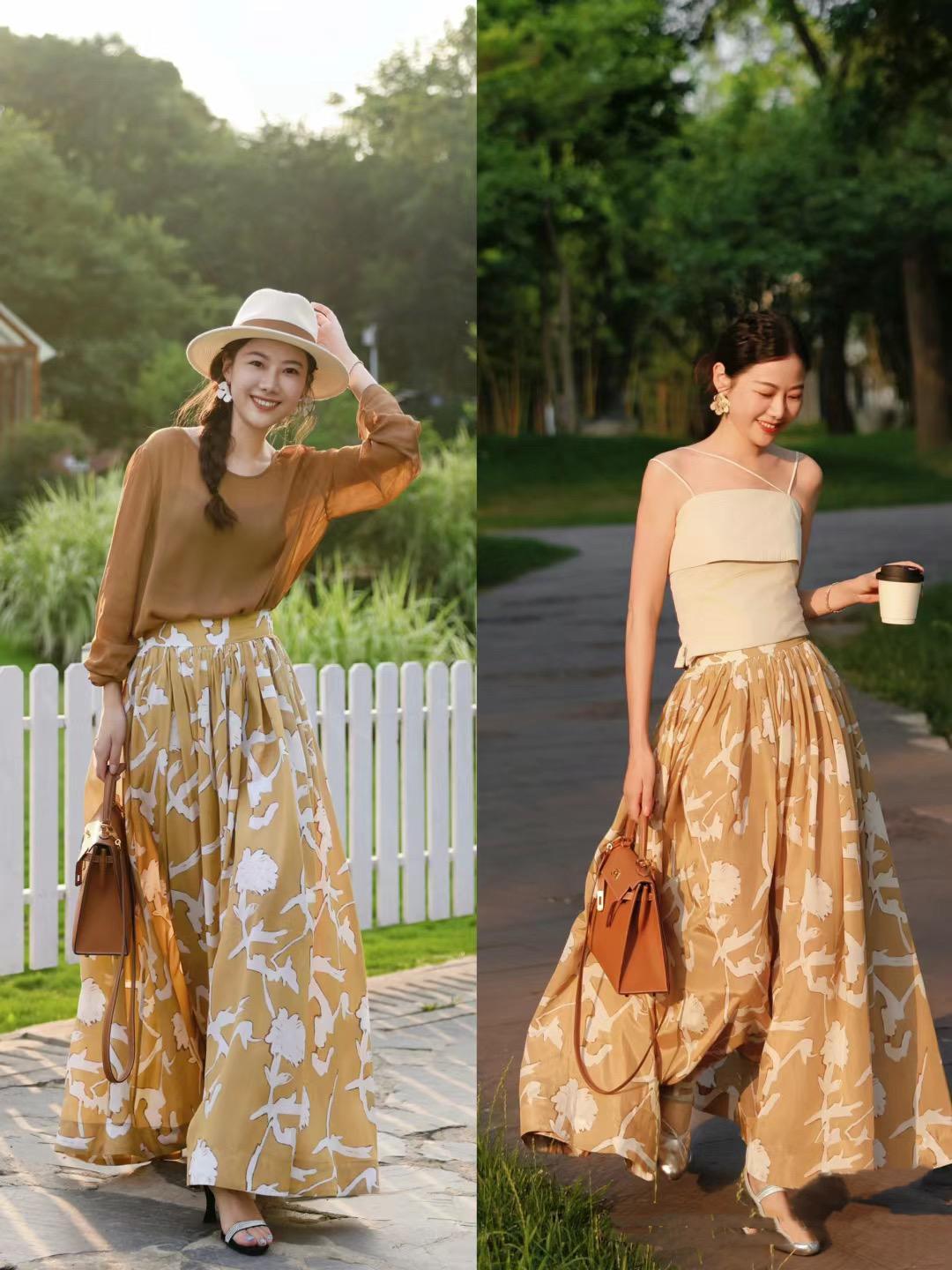 一條高腰的闊腿裙褲,既慵懶又從容。搭配杏色的吊帶、或者棕色的罩衫,都屬於臨近色的搭配。可以浪漫鬆弛、也可以清爽洋氣,同色系穿搭都很優雅。