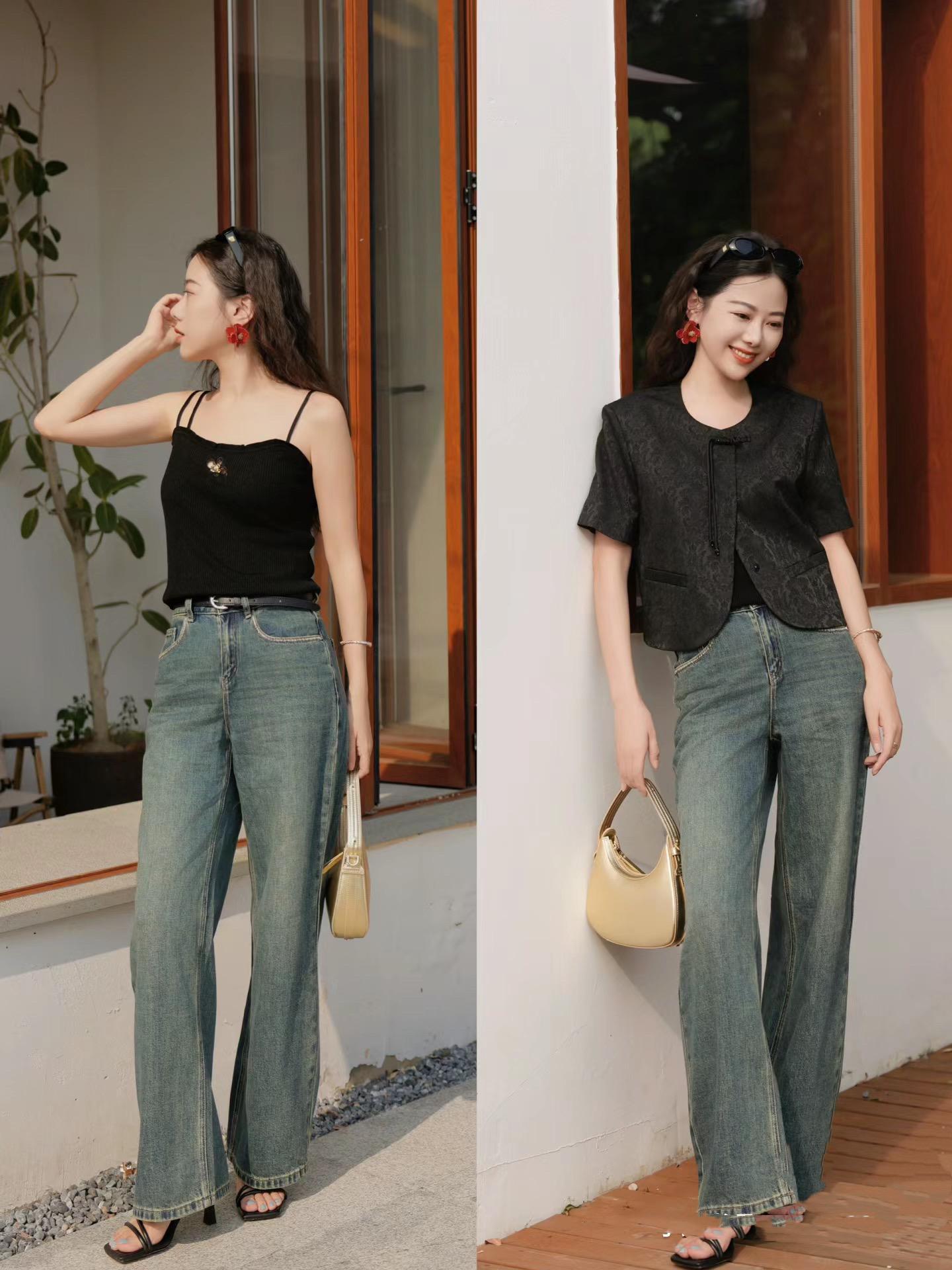 同時腹部所聚集的肉肉,都可以通過寬鬆的復古藍牛仔褲進行掩蓋。黑色吊帶背心+復古藍的直筒牛仔褲,塑造出更熱辣洋氣的美。黑色吊帶背心,勾勒出肩頸線更時尚醒目。