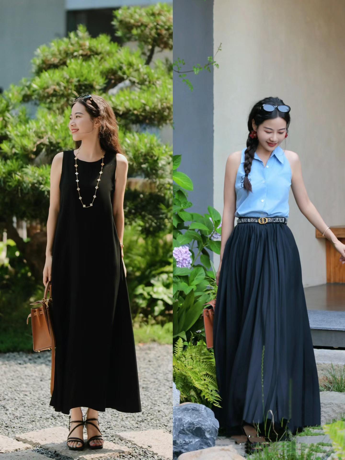 比如這種黑色的背心裙,如果直接單穿、難免顯得慵懶乏味了點。搭配高級感的珍珠項鍊,整體風格瞬間變得洋氣了許多,項鍊還可以拉伸頸部線條、多了亭亭玉立之美。