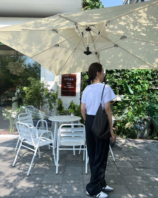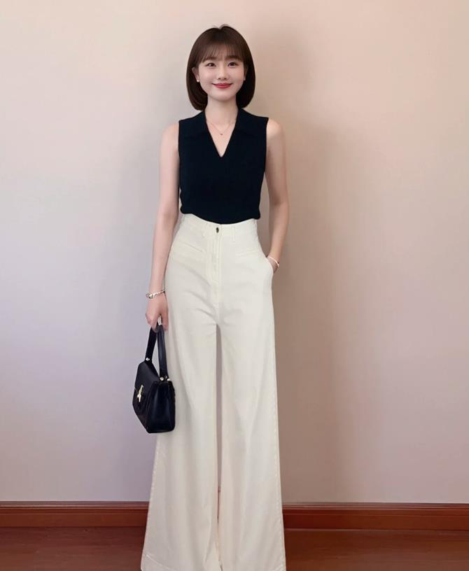 這個夏天,我最愛的還是闊腿褲,這種寬鬆版型的褲子,對身材沒有一點約束感,胖瘦身材都可以駕馭。高腰白色闊腿長褲,上身穿實在是太顯腿長了,有種腰下全是腿的既視感,搭配黑色無袖衫,黑白配看起來就很耐看高級。