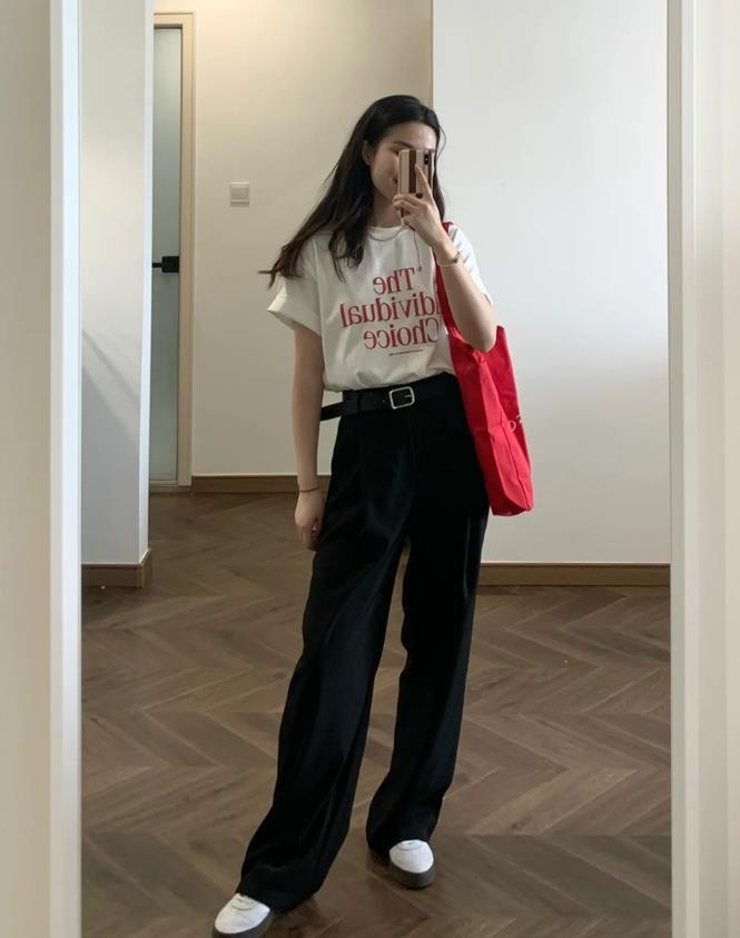 很適合打工人的一套穿搭,當然了,在日常逛街也是可以這麼穿的,白色字母t恤和黑色休閒西裝褲的結合,帶着些中性帥氣感,腰間利用起一條腰帶進行點綴,修飾身材的同時又提高了腰線比例,視覺上雙腿看起來更修長了。