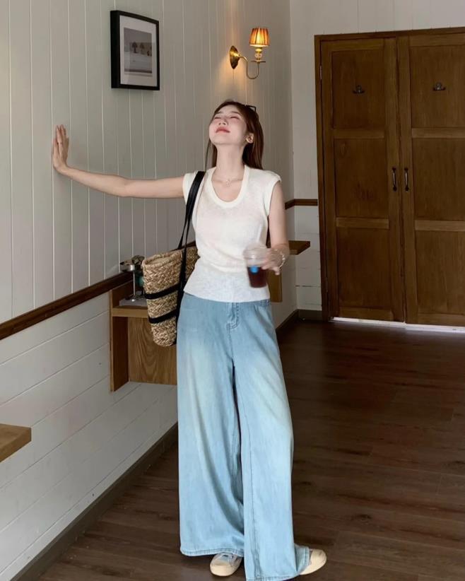 真的好喜歡這種慵懶又帶點鬆弛感的穿搭,清爽又幹淨,大夏天這麼穿實在是太合適了,白色無袖上衣+闊腿牛仔褲,簡約又不失韓系風。寬鬆的褲子版型,既遮掩了腿粗的缺點,又拉長身材比例,簡簡單單就穿出女神範。