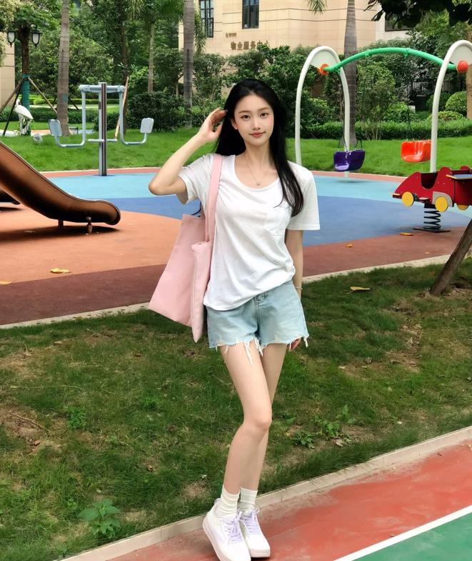 腿部比例好的姐妹,大夏天一定要選擇一條短褲來穿,牛仔短褲就是非常不錯的選擇,與純白基礎t恤相配,這麼一套乾乾淨淨的,再搭配上一雙小白鞋,休閒舒適又自在。