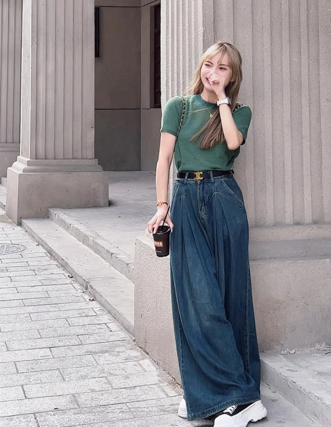 時尚圈就是個輪迴,但像闊腿褲這種褲子,就是可以永遠存在於時尚圈裏,還不容易過時,牛仔闊腿長褲,穿起來實在是太舒適自在了,也很隨性和自在。選擇一件修身的短袖t恤來配,一鬆一緊的組合,輕鬆優化了整個身材。