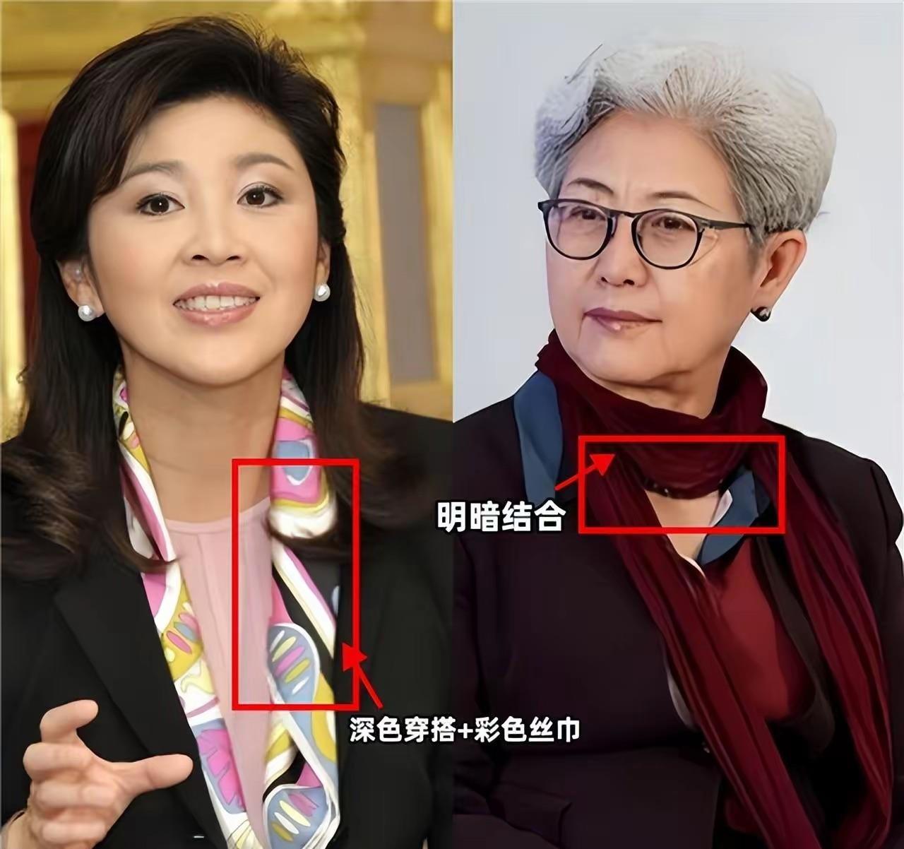 暗色系的衣服,自然是與亮色系的絲巾更配。色彩上的敏感組合,不僅更加時髦、醒目,也更爲洋氣顯貴,可以在不經意間弱化年齡感。
