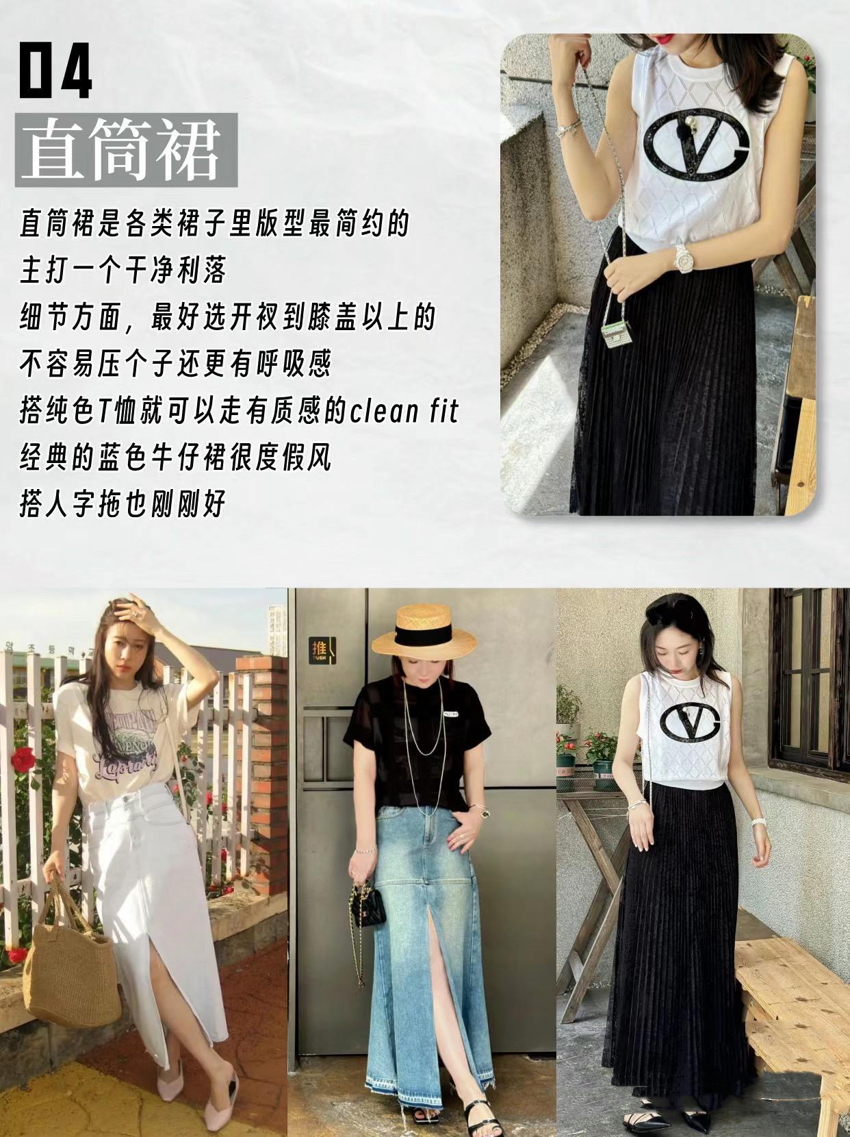 直筒半身裙我們可以選擇經典的黑白色、或者牛仔色,色系簡約高級、也可以降低搭配難度。
