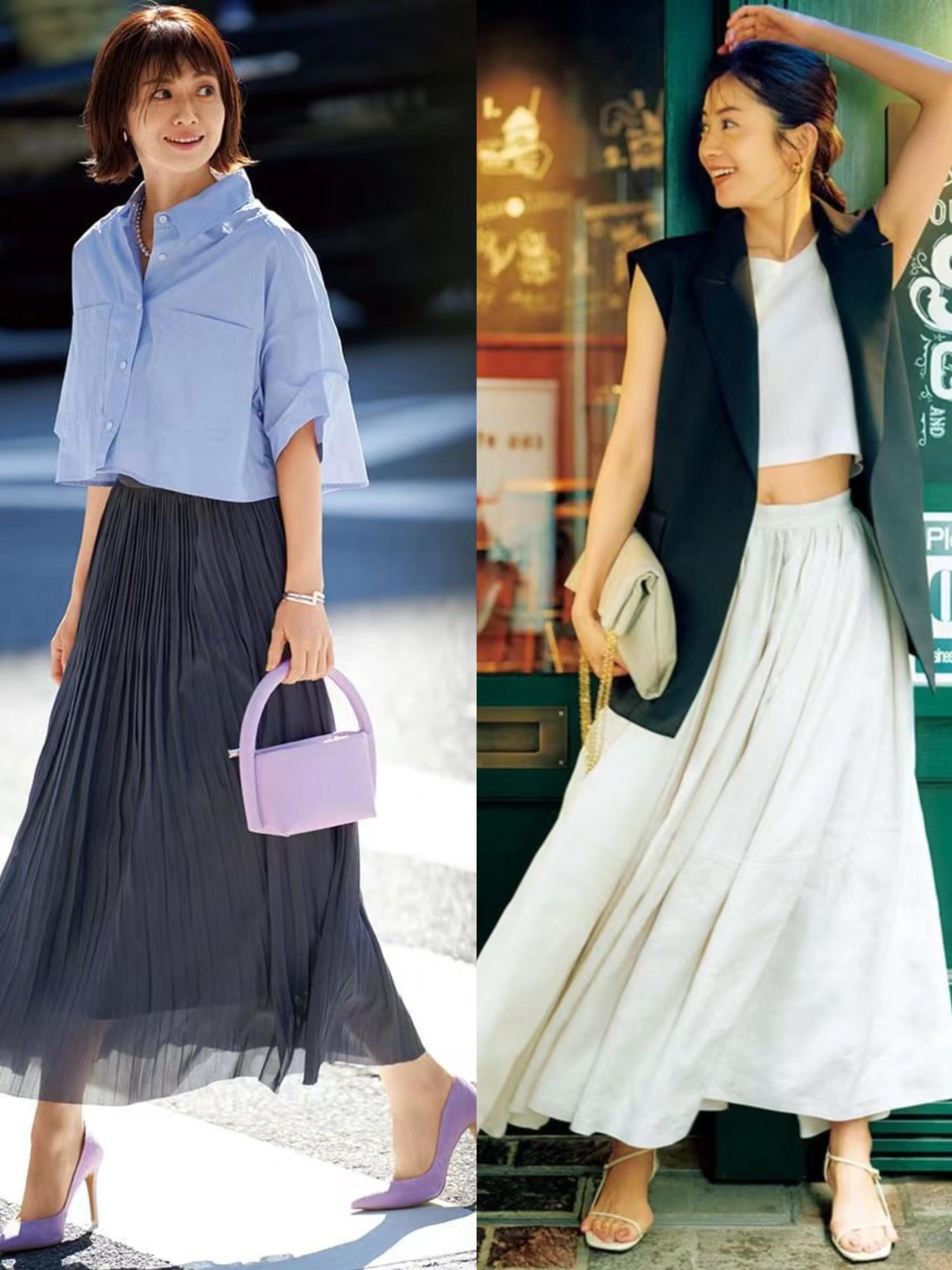 大齡女生選擇百褶半身裙的時候,建議選擇過膝的長度、輕盈垂順的面料。比如雪紡、苧麻、醋酸等等。