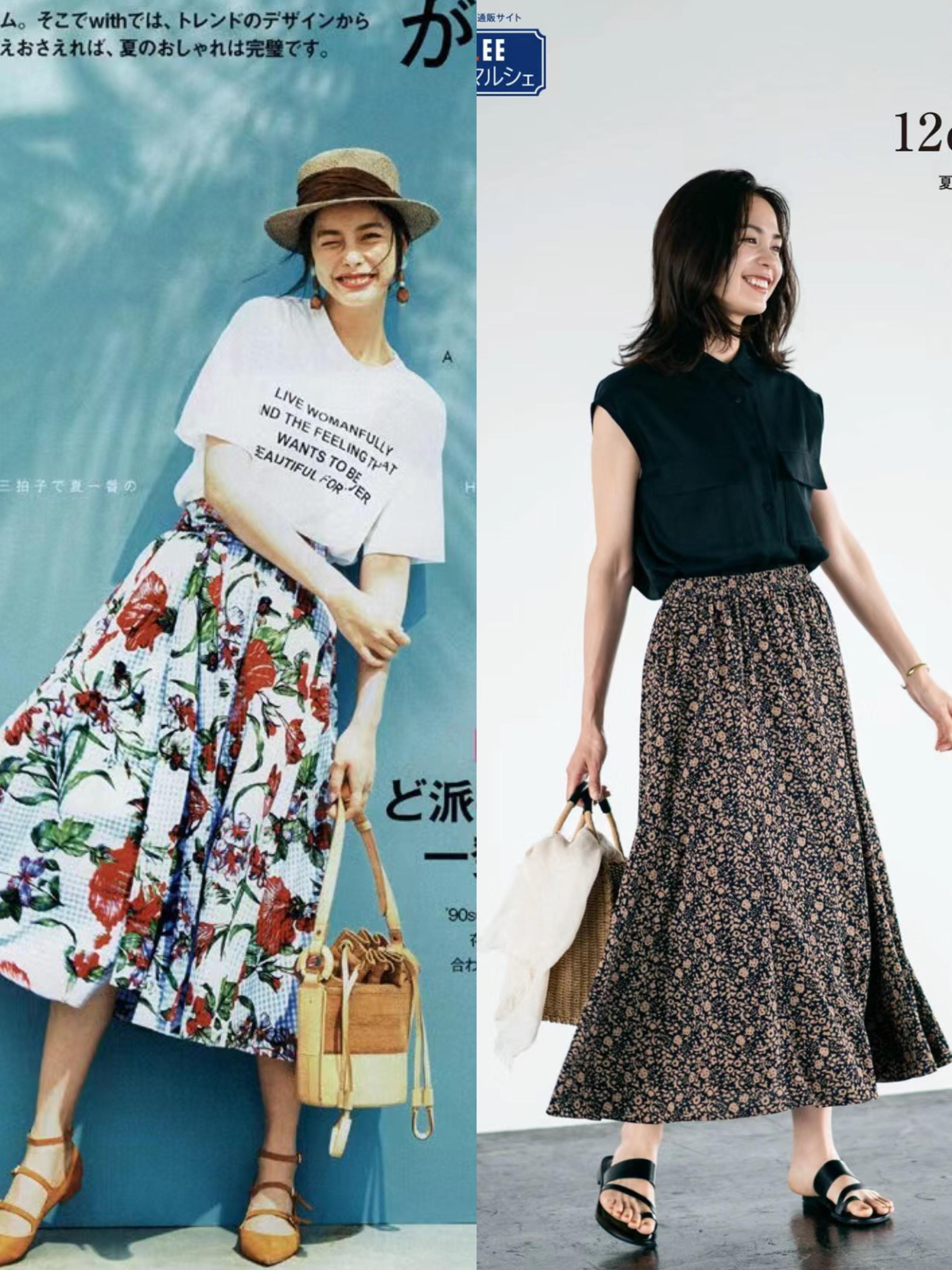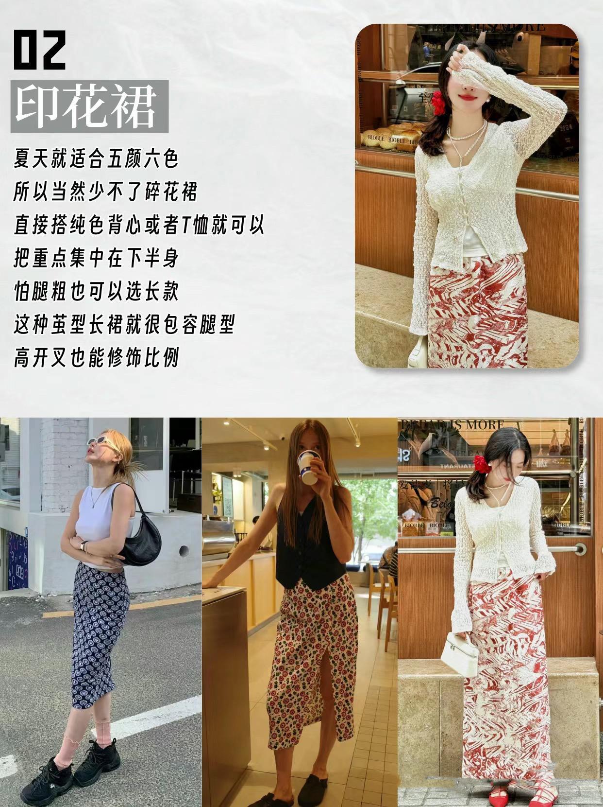 如果想要保守一點,就搭配比較素雅的印花修飾。印花半身裙可以選擇H型或者A字形剪裁,搭配高開叉就可以修飾比例。