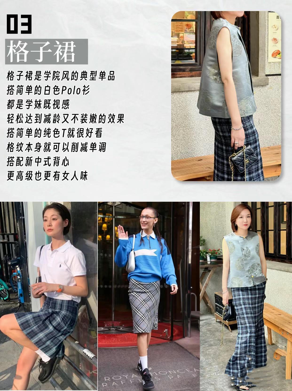 搭配襯衫、西裝馬甲、polo衫,都是不錯的選擇,格子半身裙,多選擇暗色系的格子,更具腔調感。