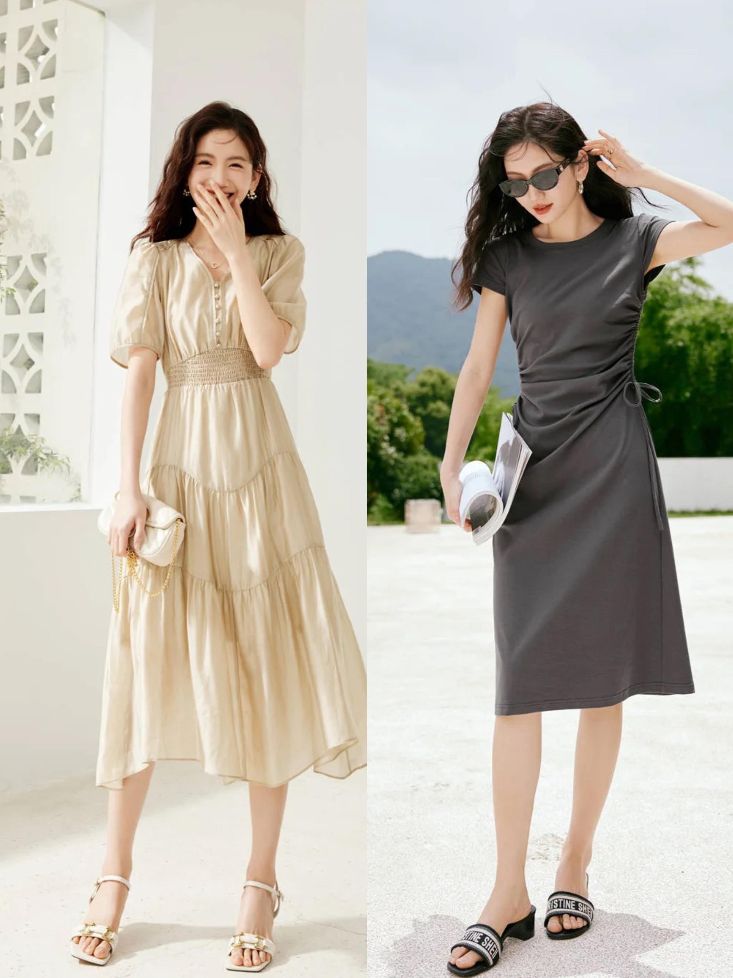腰部的捏褶、抽繩,以及小V領+收腰設計,波浪形的裙襬、遮肉的泡泡袖,都可以讓我們的夏日穿搭變得簡約又時尚。