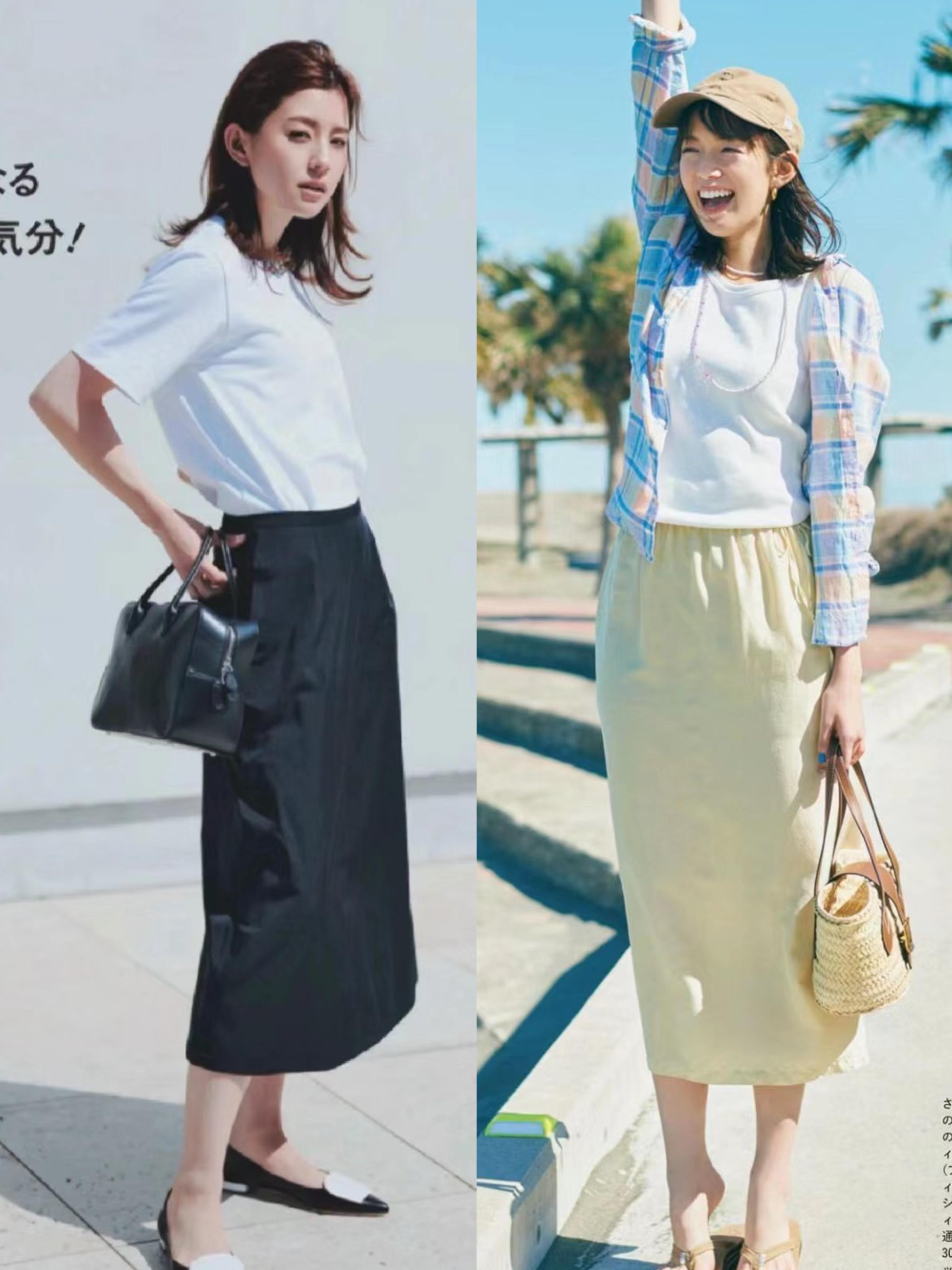 黑色直筒半身裙,更加高級顯瘦,配白色T恤也大方耐看。鵝黃色直筒半身裙,青春活力、配白色T恤朝氣蓬勃。