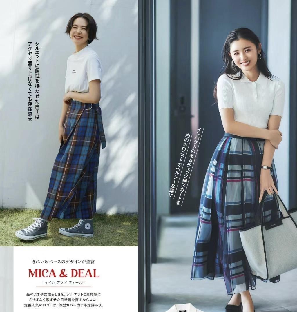 夏天裏的格子半身裙,想要更遮胯顯瘦一點,就搭配高腰+大裙襬,可以配合百褶、波浪的剪裁。