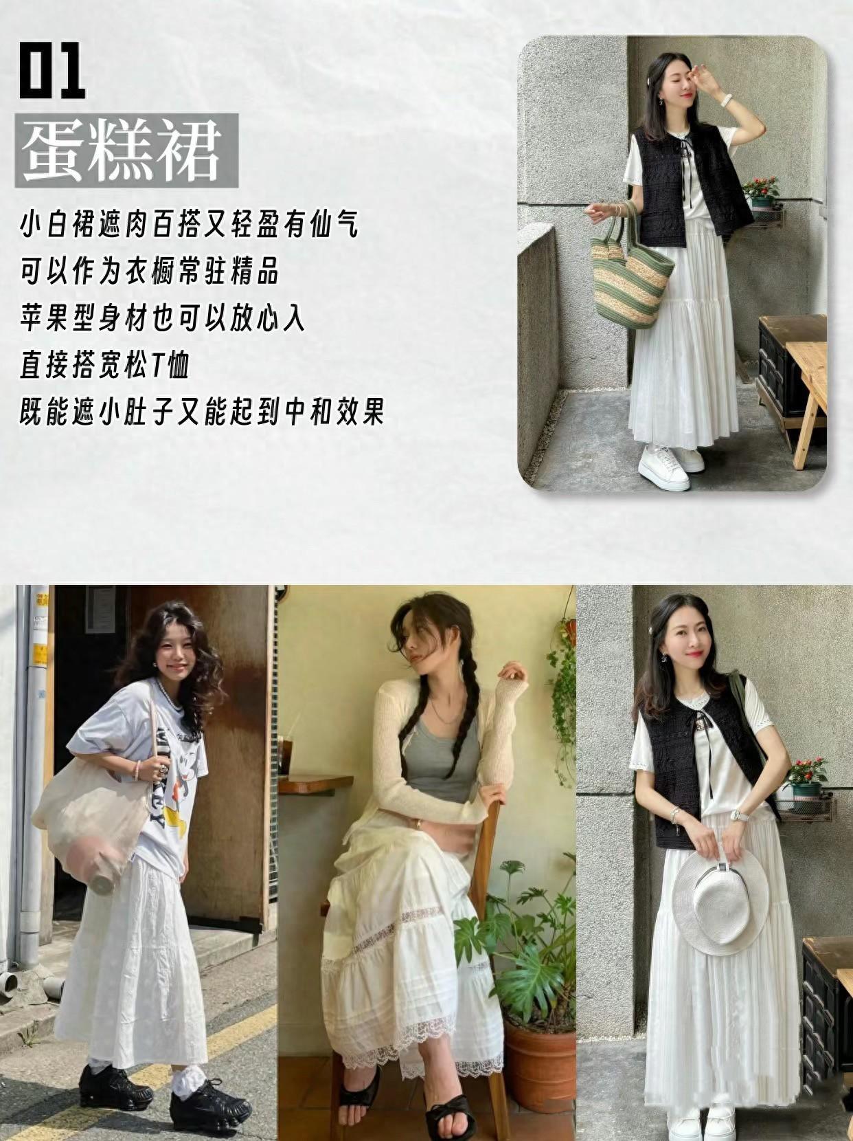 蛋糕裙最的優勢就是裙襬寬鬆,既能遮小肚子又不會顯得邋遢,白色蛋糕裙還自帶涼意。