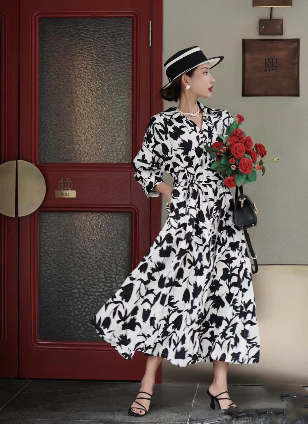 醒目的黑白撞色,大面積的印花,這種度假風連衣裙也格外出彩。配一雙夾腳趾的拖鞋就剛剛好,度假風的慵懶和愜意都出來了。