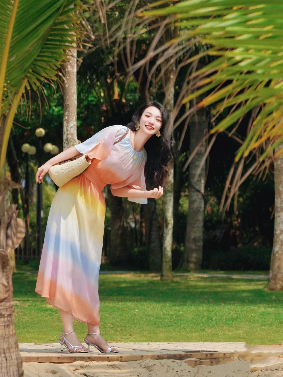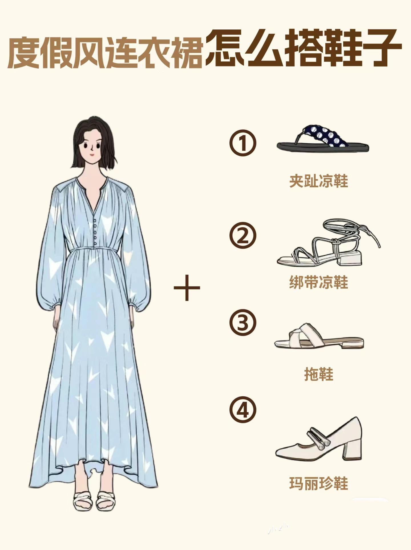 度假風連衣裙,更適合搭配一些個性洋氣、清涼時尚的鞋子。比如夾趾涼鞋、綁帶涼鞋、拖鞋、瑪麗珍鞋等等!