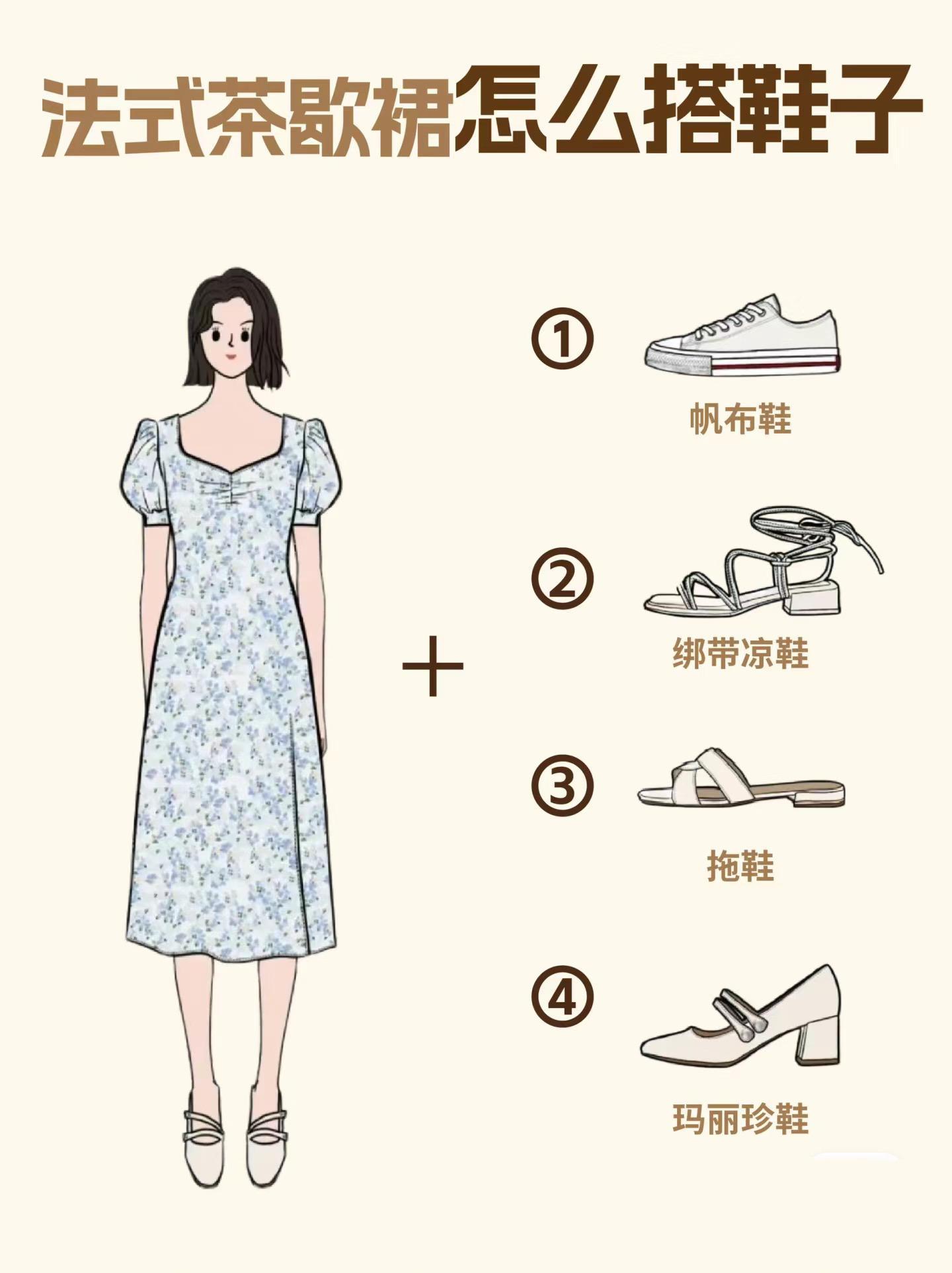 更加優雅清新、也更具女人味的穿搭法式茶歇裙,自然需要配一雙更有精緻耐看的鞋子呀。可以搭一切的帆布鞋、性感的綁帶涼鞋、輕便的拖鞋、優雅的瑪麗珍鞋,與法式茶歇裙都很配。