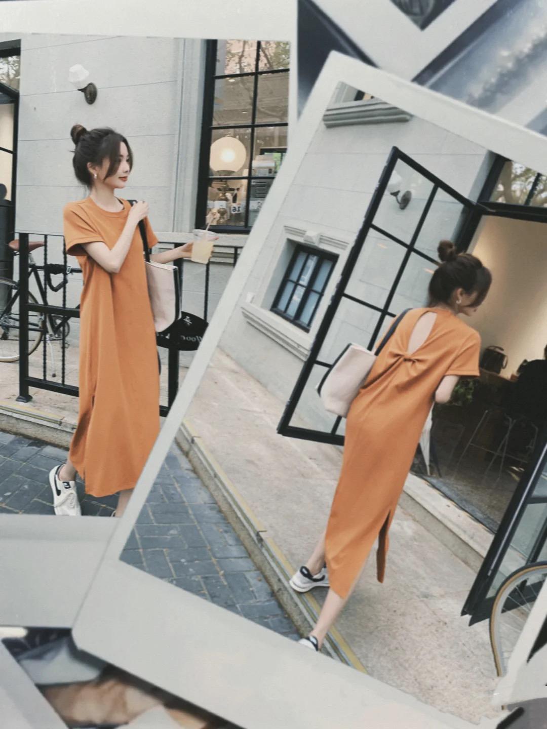 寬鬆的T恤連衣裙,加上小心機的設計對小個子也很友好呀。紐結+露背+開叉對剪裁,也太洋氣了吧。