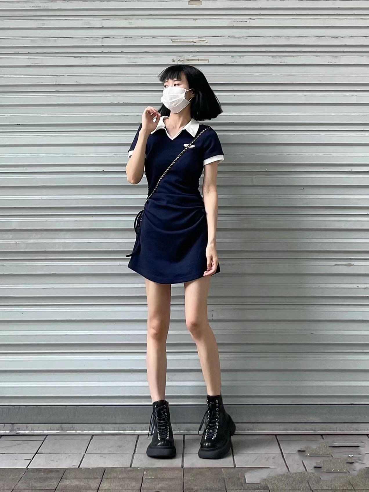 辣妹風的穿搭,還是與馬丁靴更配。收腰的T恤連衣裙,搭配厚底鉚釘修飾的馬丁靴,又美又颯!