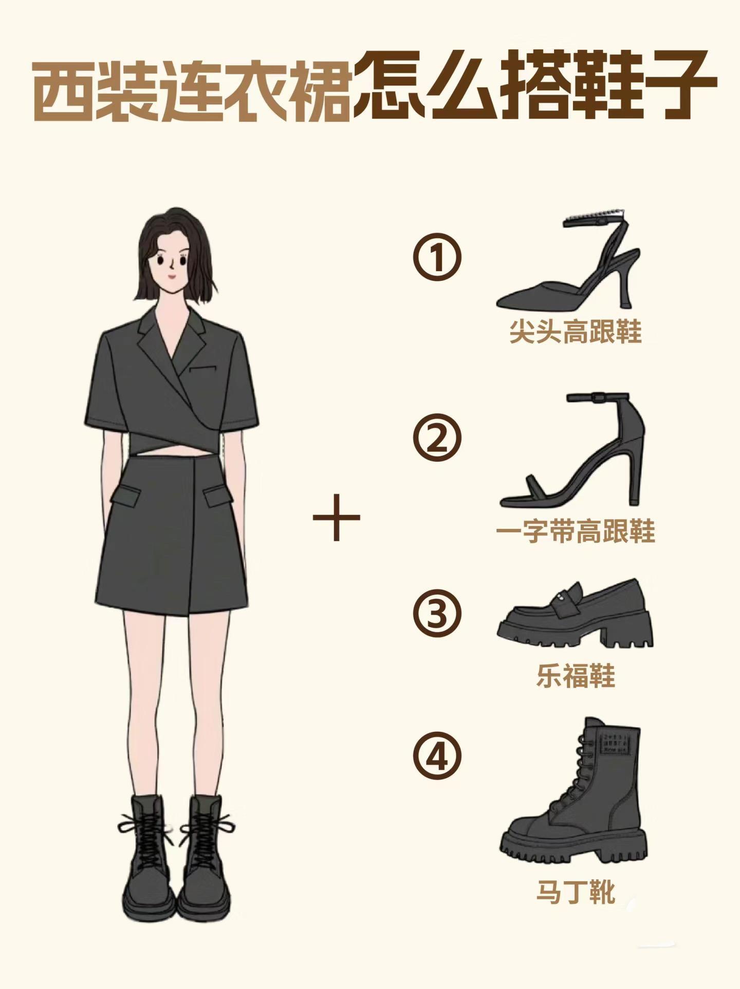 這種酷颯且幹練的西裝連衣裙,自然要配風格屬性明顯的鞋子。風格屬性的強化,也可以營造西裝連衣裙的氛圍。比如尖頭高跟鞋、一字帶高跟鞋、樂福鞋、馬丁靴等。