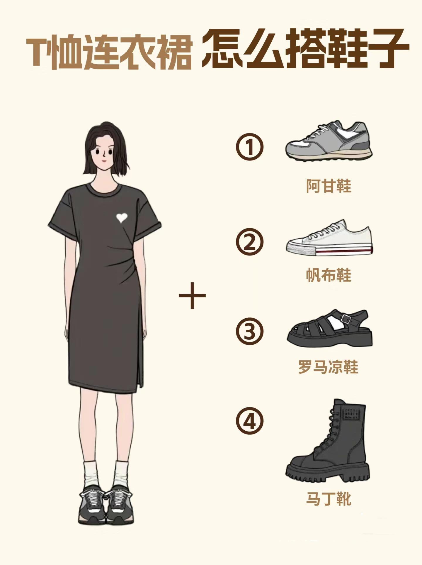 偏向休閒活力風的T恤連衣裙,自然與運動風的鞋子更配。比如阿甘鞋、帆布鞋、羅馬涼鞋、馬丁靴等。