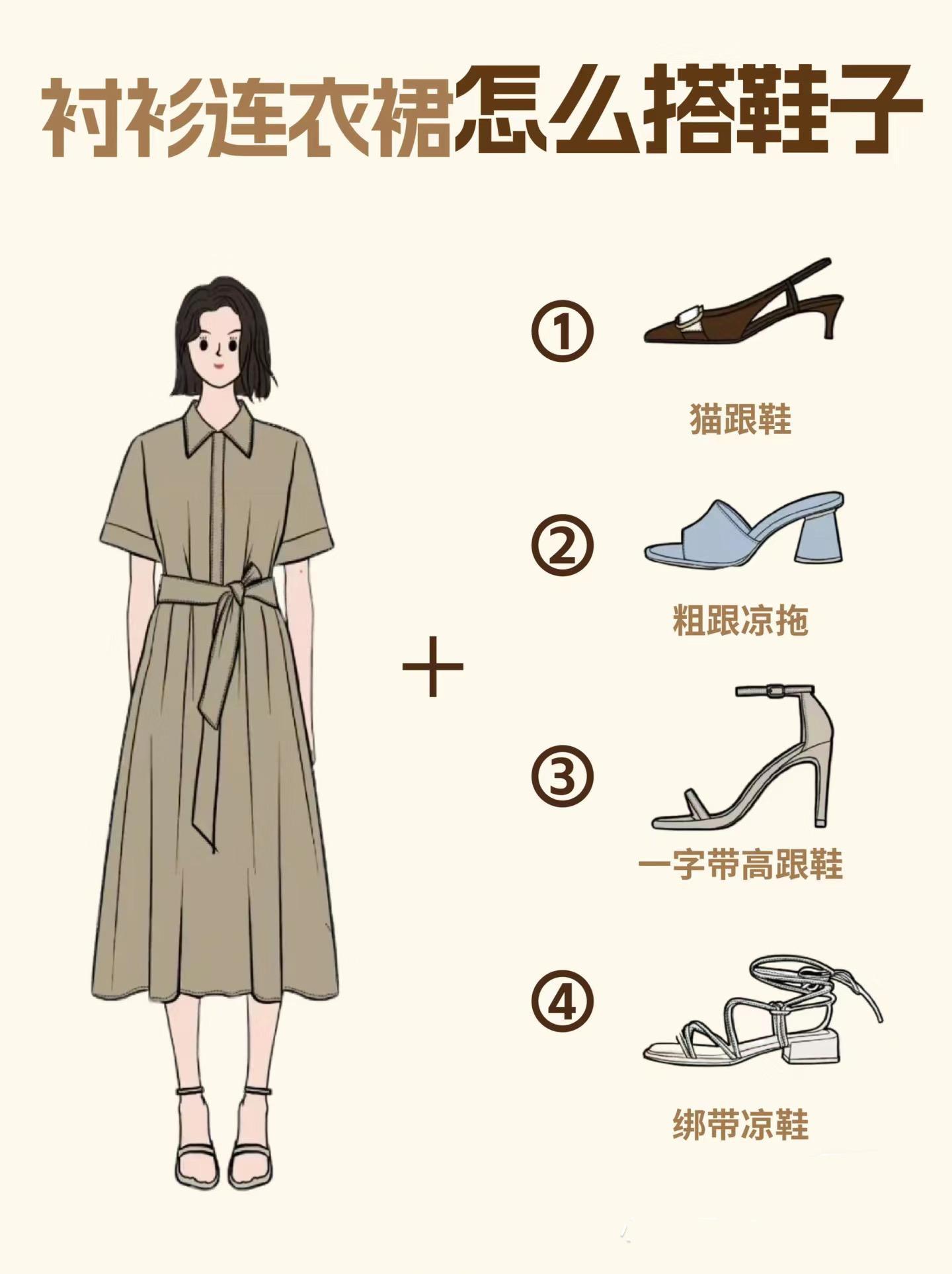 精緻的貓跟鞋、優雅的粗跟涼鞋、簡約的一字帶涼鞋、個性的綁帶涼鞋,都可以配襯衫連衣裙來穿着。