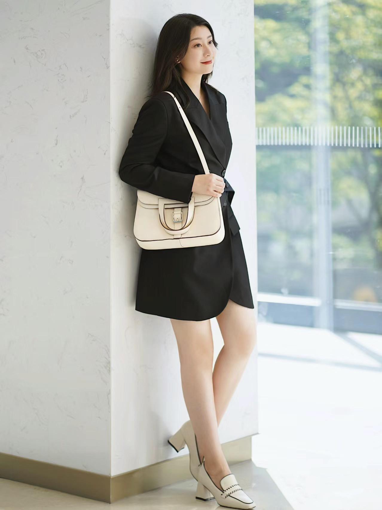 西裝連衣裙的酷颯,走路帶風的氣場,與裸色尖頭高跟鞋的搭配,更符合職場女性的高級審美,大方又有力量。