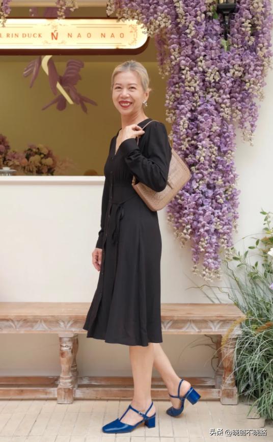 上了年紀的女性在穿衣上都十分強調得體和端莊感,呢麼無論是款式還是顏色都要注意避免過於花哨,保持一定的端莊和穩重。但這並不意味着我們完全不能嘗試帶有設計感或者鮮豔配色的單品,只是要縮小它們的佔據面積。比如我們可以身穿一條黑色的襯衫裙搭配藍色的涼鞋,增加整體的精緻感和洋氣效果。