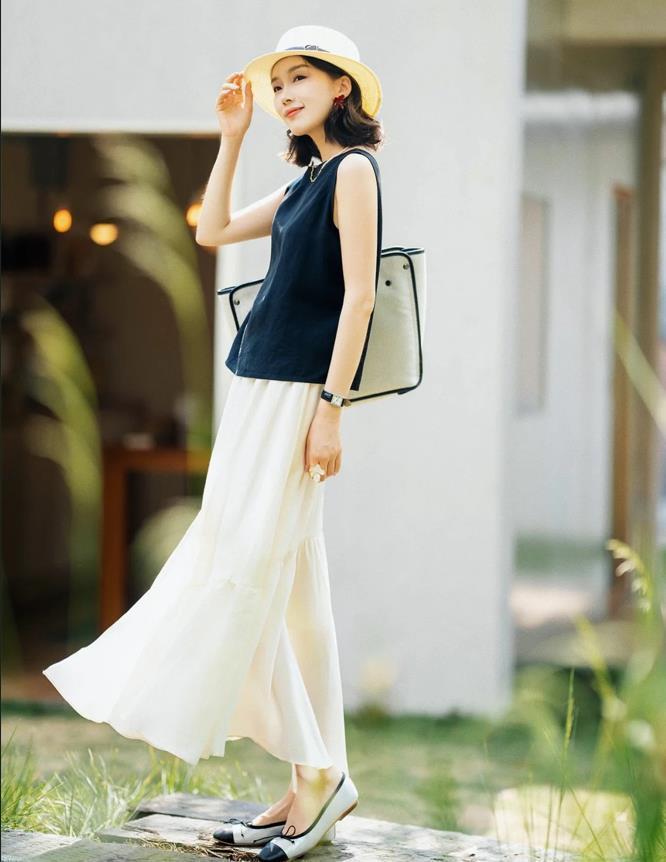 今年夏天那麼流行的植物系穿搭,你真的不願意嘗試一下嗎?黑白配的組合,實在是太顯高級了,很耐看又時髦。黑色無袖衫+白色半身長裙,這種垂墜感極佳的裙子,面料也很柔軟舒適輕盈,出門簡單配一雙單鞋就好,超級顯溫柔的。