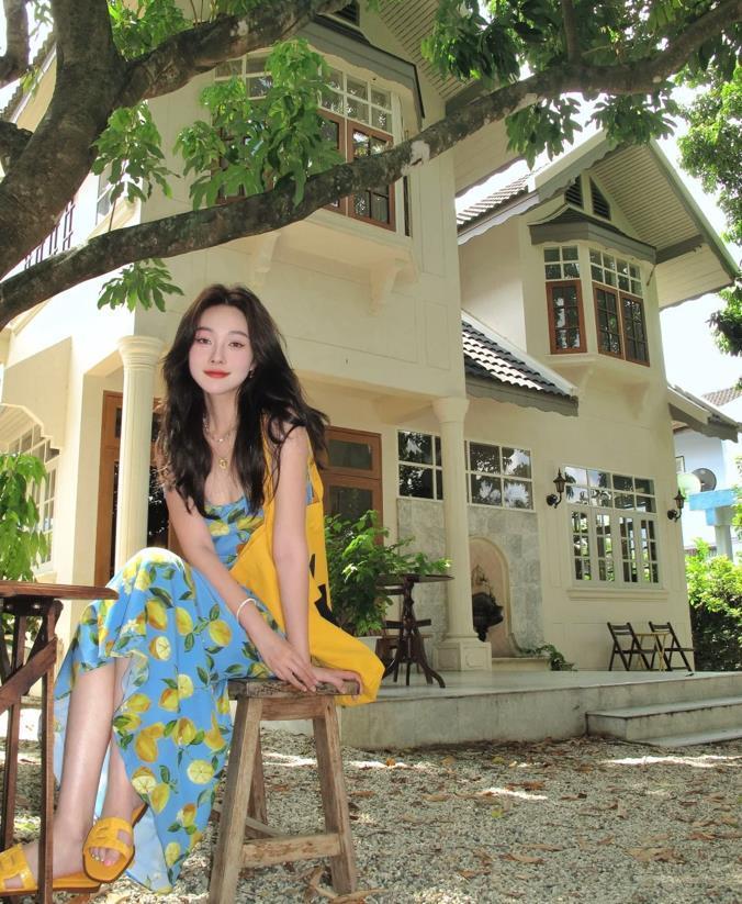 沒有人會不喜歡檸檬味的夏天吧,綠色印花吊帶連衣裙,真的太顯清新了,自帶小性感和清爽。挎着一個明亮黃色的包包和同色涼拖鞋,真的很明豔動人呢!