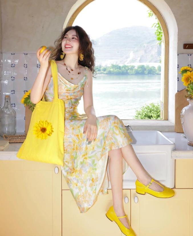 夏天是屬於大海和檸檬色的,明亮動人的檸檬黃色裙子,帶點花色的款式,看起來就非常顯浪漫呢。腳下踩着的黃色單鞋和挎包,進行了呼應,和諧度十足,還不失高級。