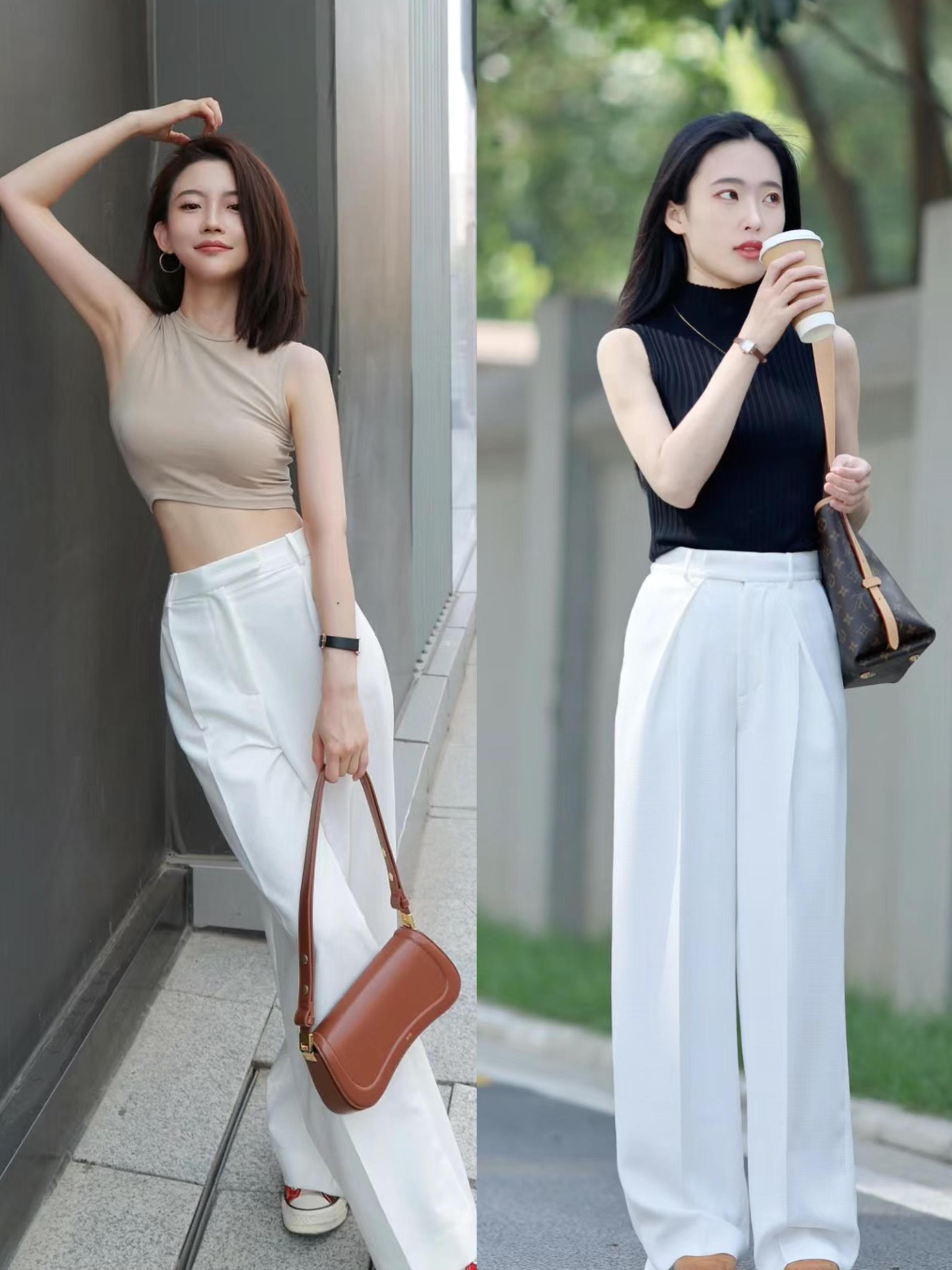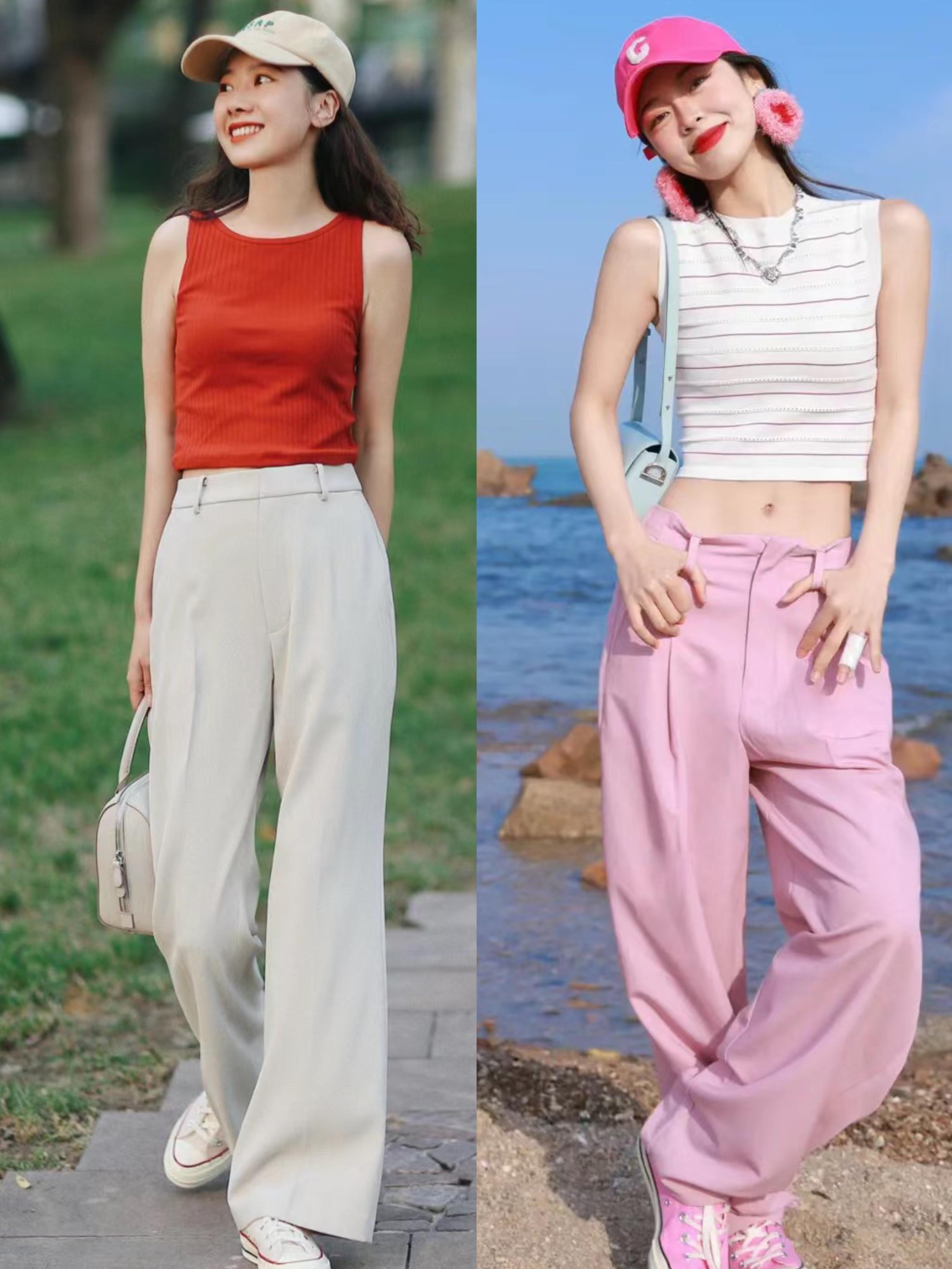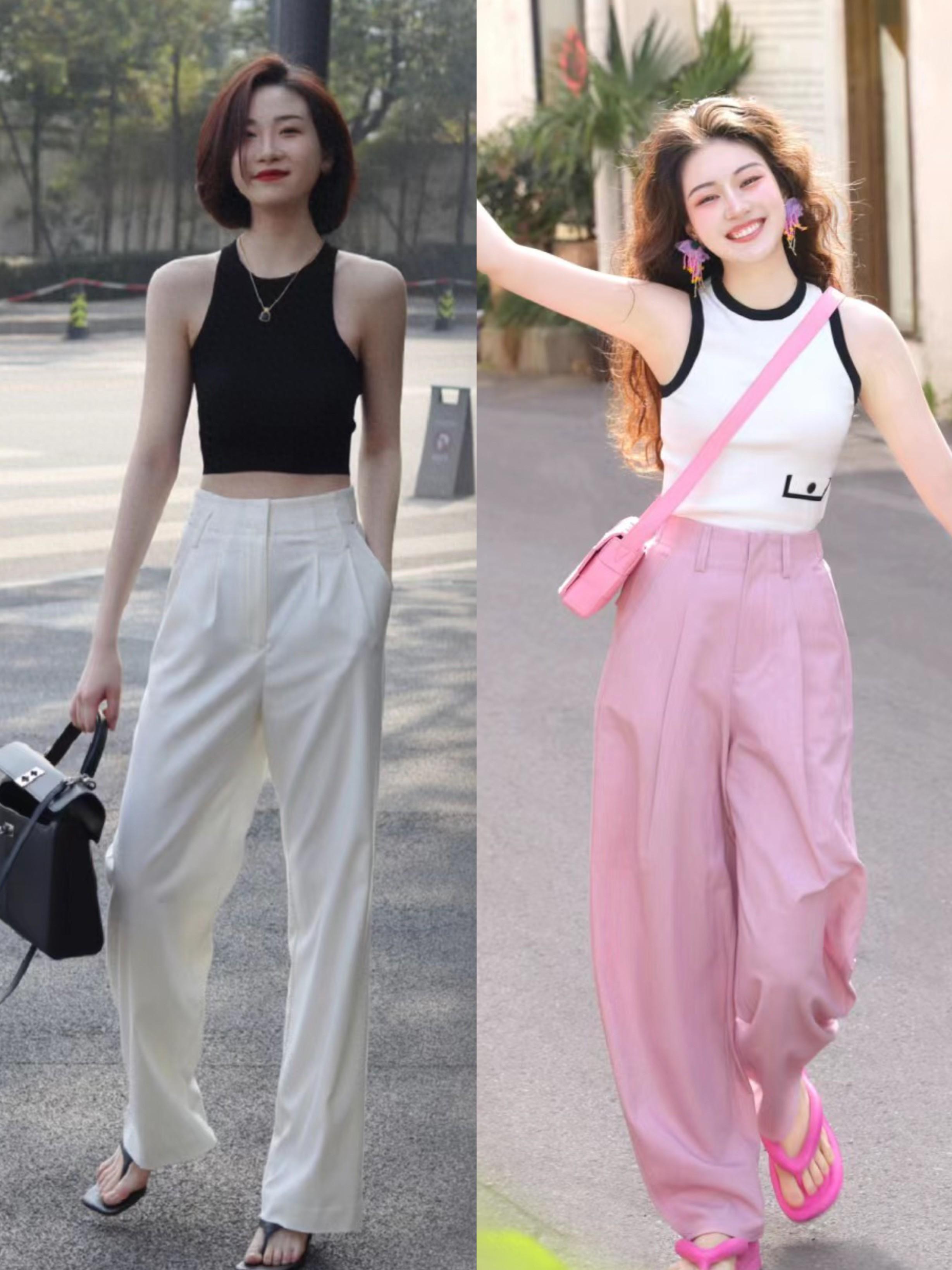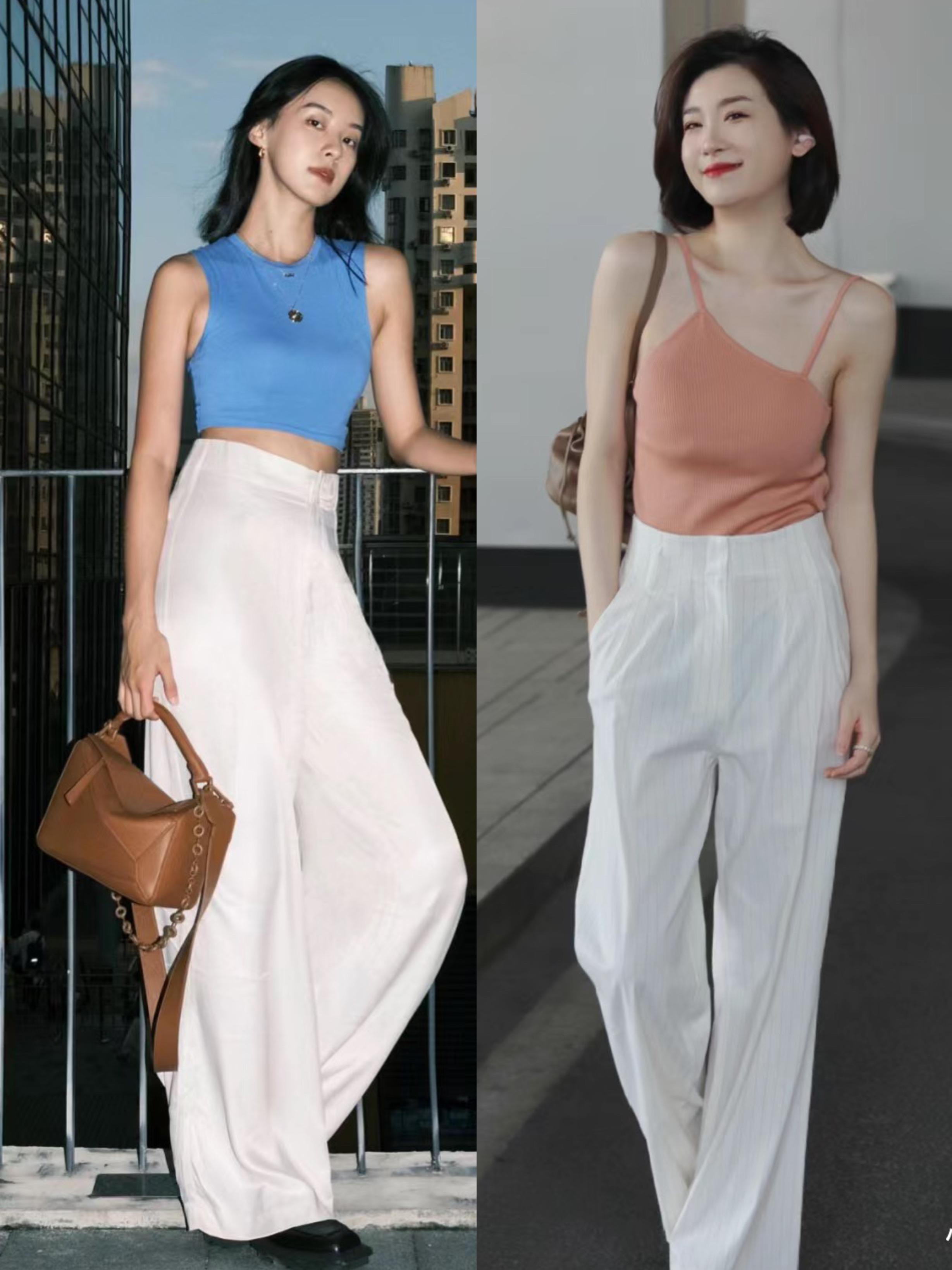 尤其是這種修身的白色吊帶背心,搭配了寬鬆的粉色闊腿褲,顯得比例更優越。減齡又大方,清爽也很洋氣。
