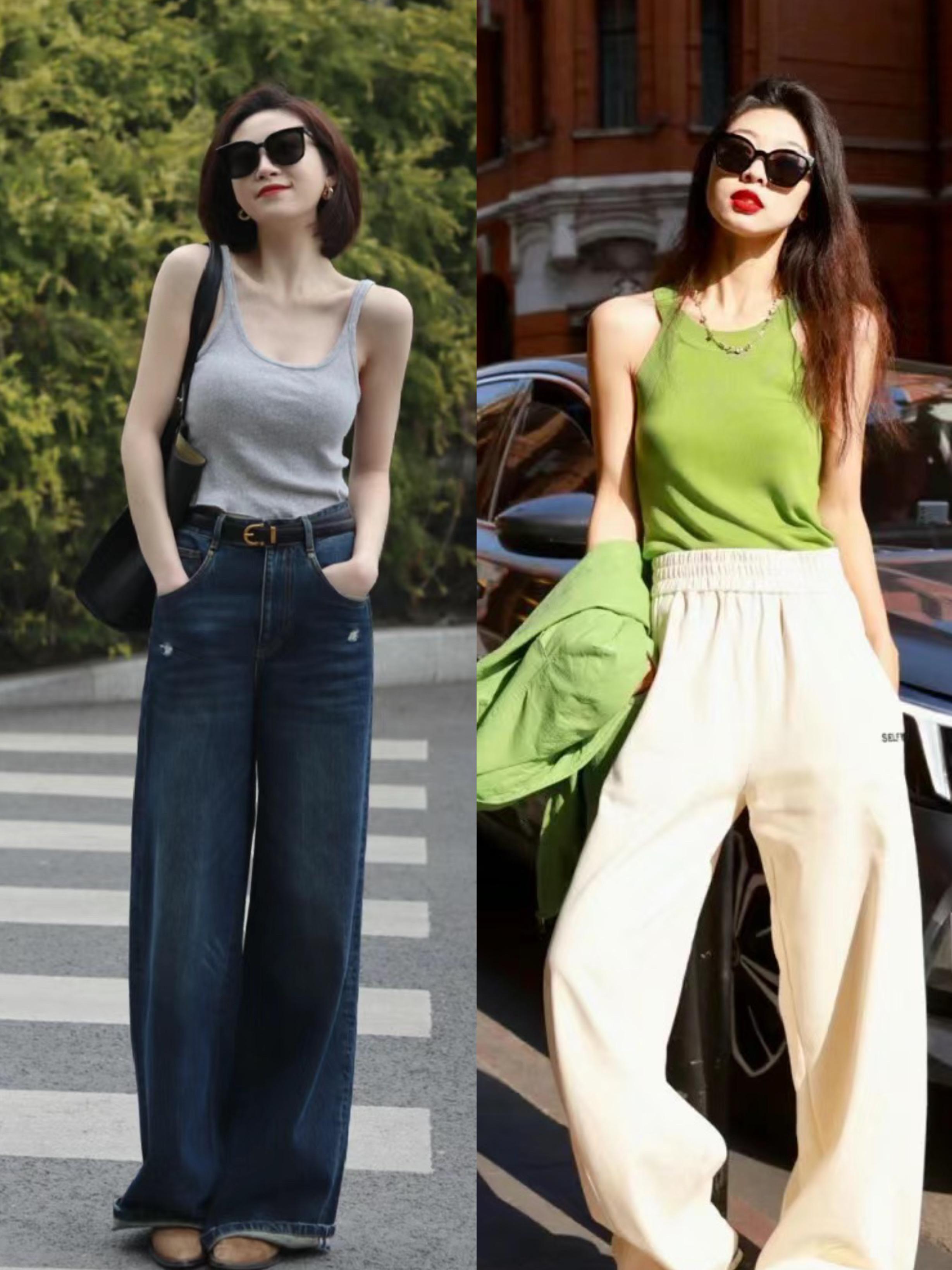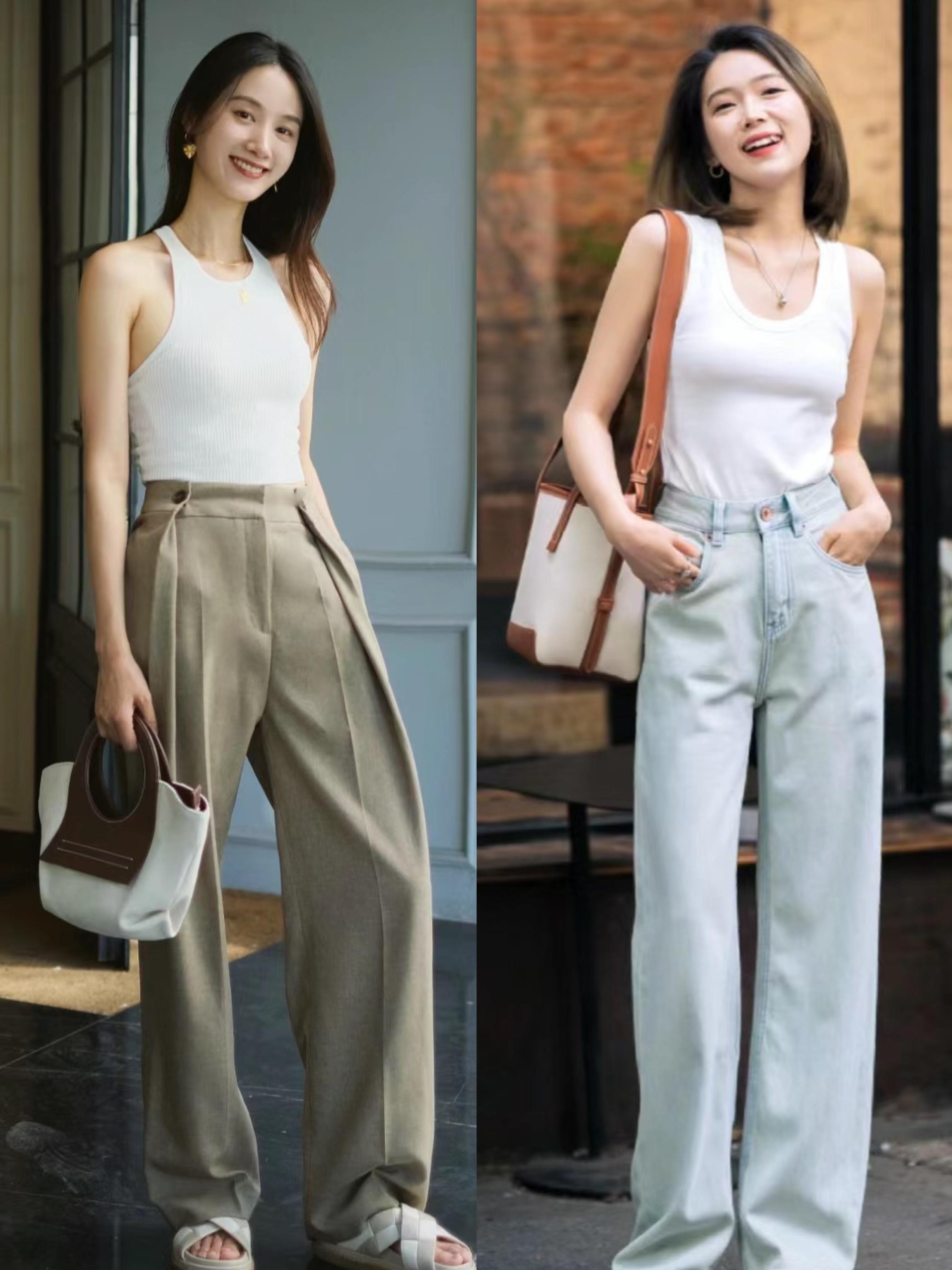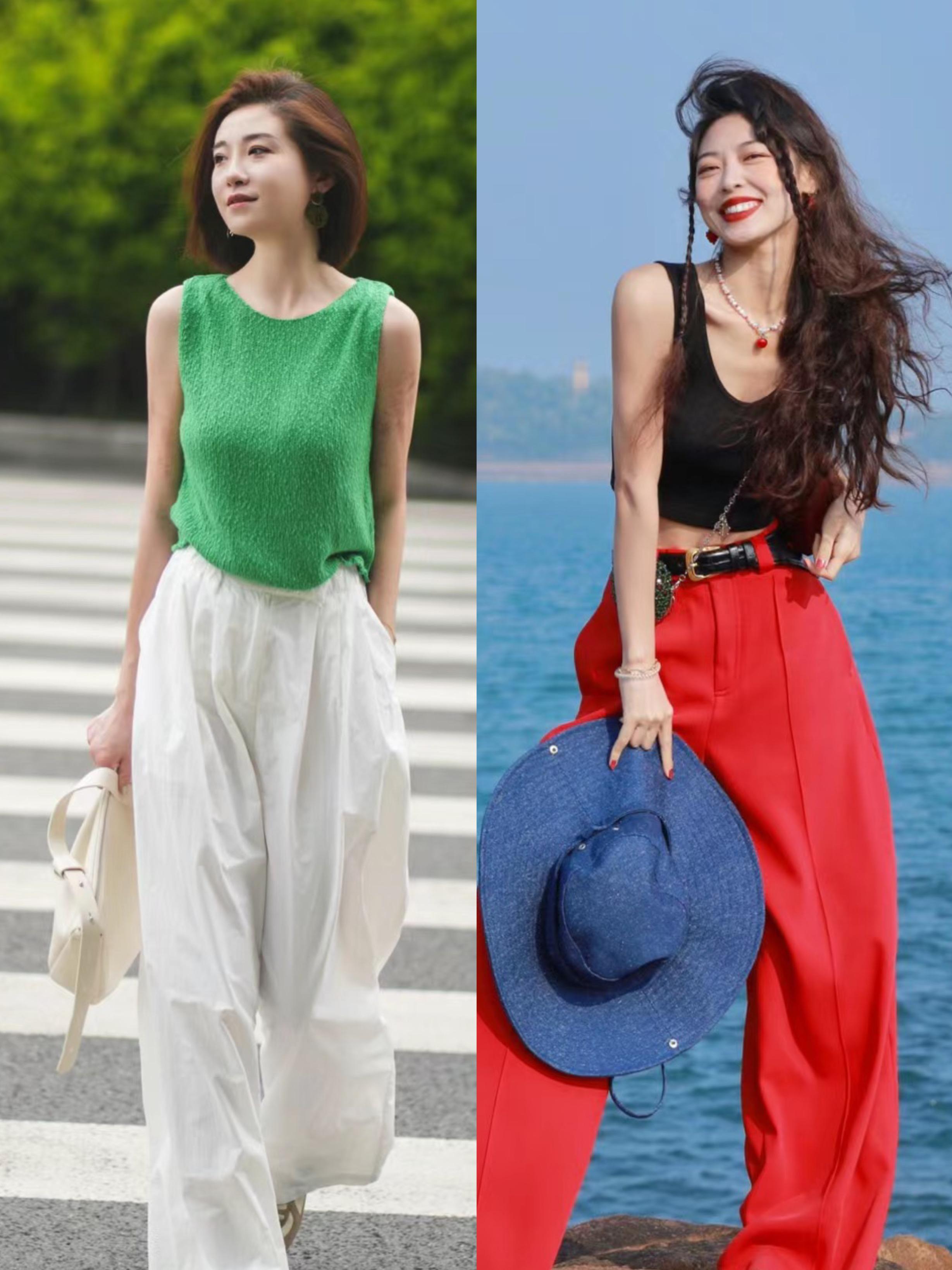 修身的小背心+撞色的闊腿褲