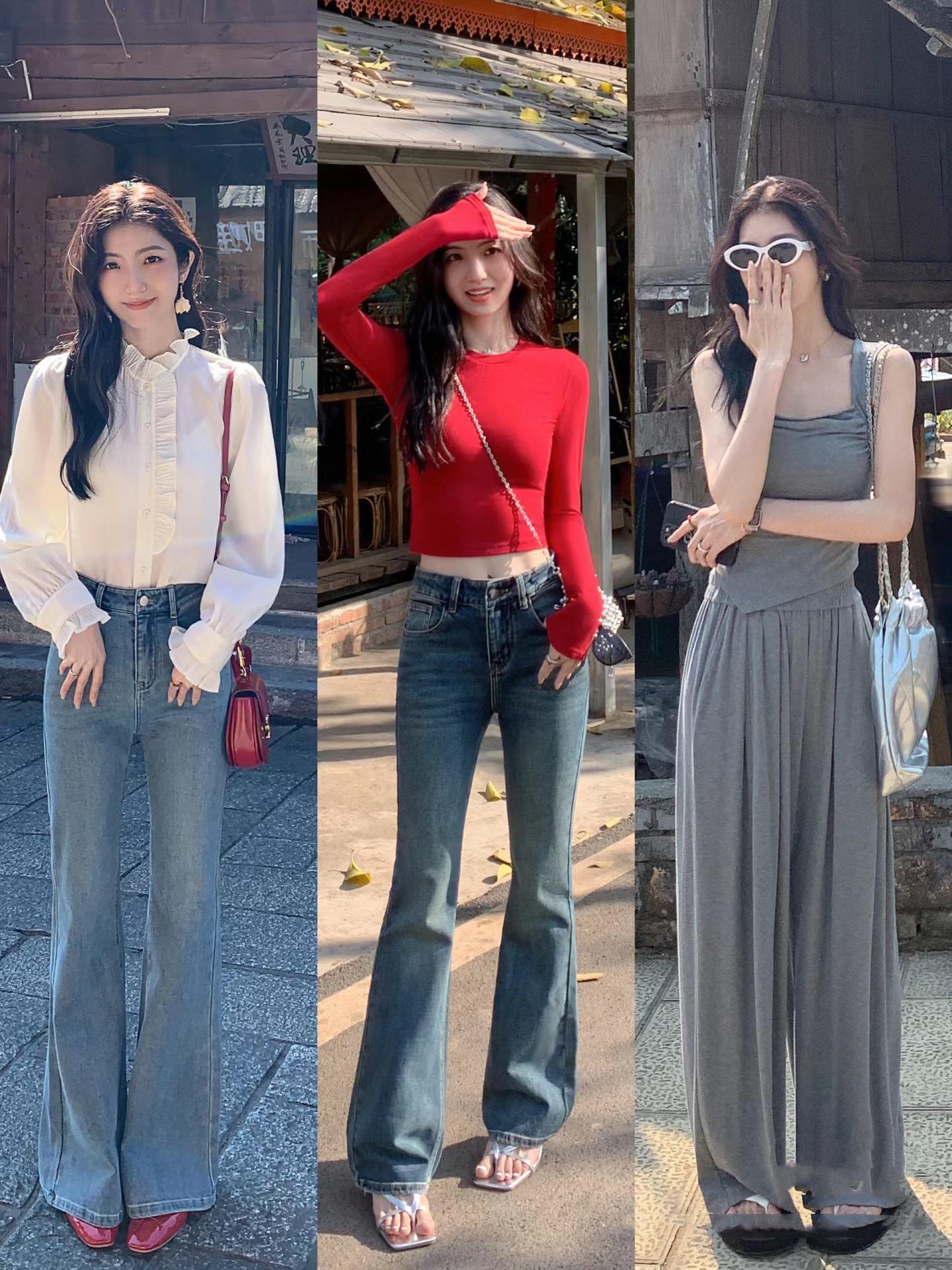 像這種高腰的闊腿褲,主打一個修飾性。抬高腰線、遮胯顯瘦、拉伸腿長,對於身材和腿型不夠自信,就選擇高腰闊腿褲。