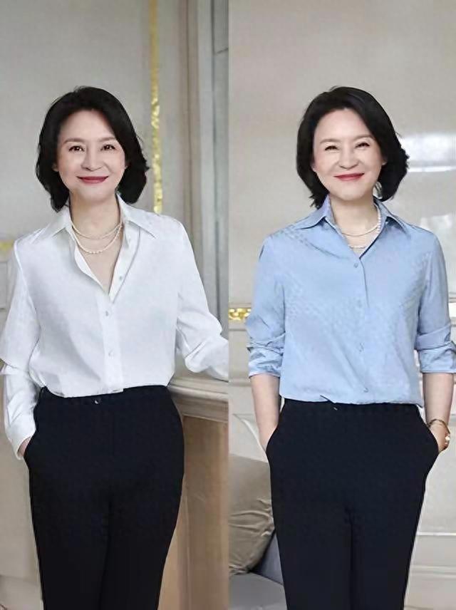 50+的職場女性,可以嘗試簡約且高級的中性風穿搭。襯衫、西褲、西裝裙、收腰的連衣裙、闊腿褲等單品都很實用。
