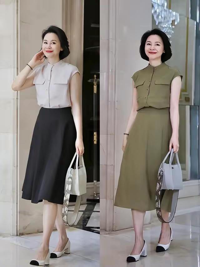 想要修飾身形,讓比例更加勻稱,腰線的強化就很關鍵。50+的女人,也可以嘗試塞衣角的方式。比如輕盈的小飛袖襯衫+高腰的傘裙,讓腰線更高挑、遮肉效果也更強。
