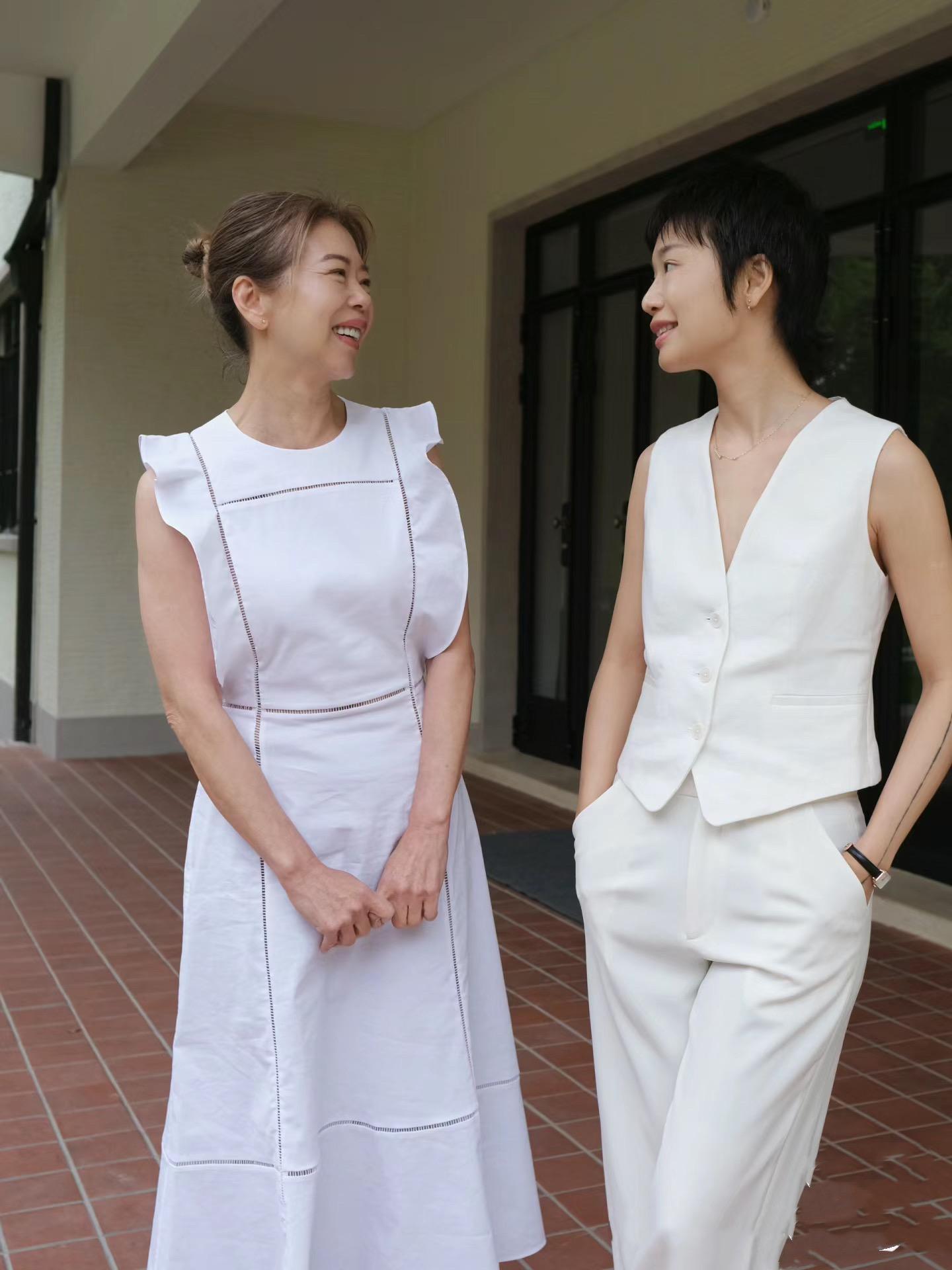 純淨的白色系,甜美的小飛袖,剛好可以修飾手臂線條。阿姨挽起長髮溫柔的笑着,她就這樣注視着女兒,優雅又慈祥。