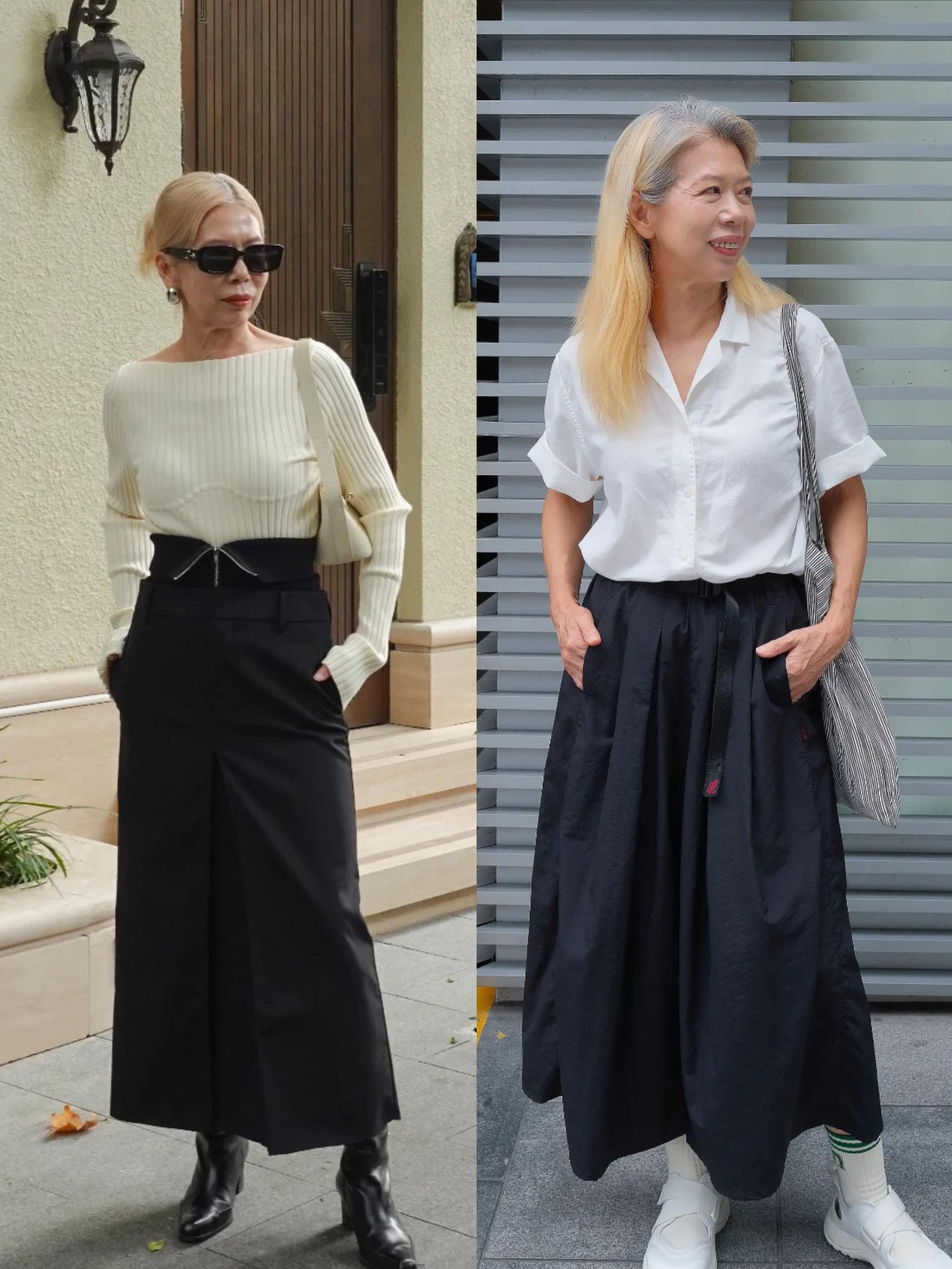 穿白色襯衫+黑色半身裙,更加適合60+女性的體型。即便是腰粗、胯寬,也沒有問題。如果腰臀部沒有贅肉感,搭配高腰的直筒半身裙,會更加利落提氣質。