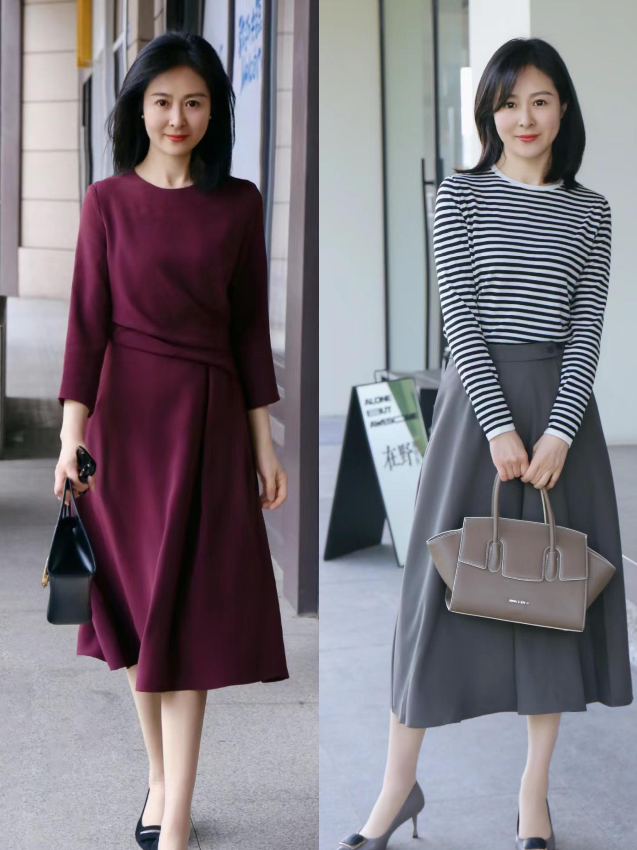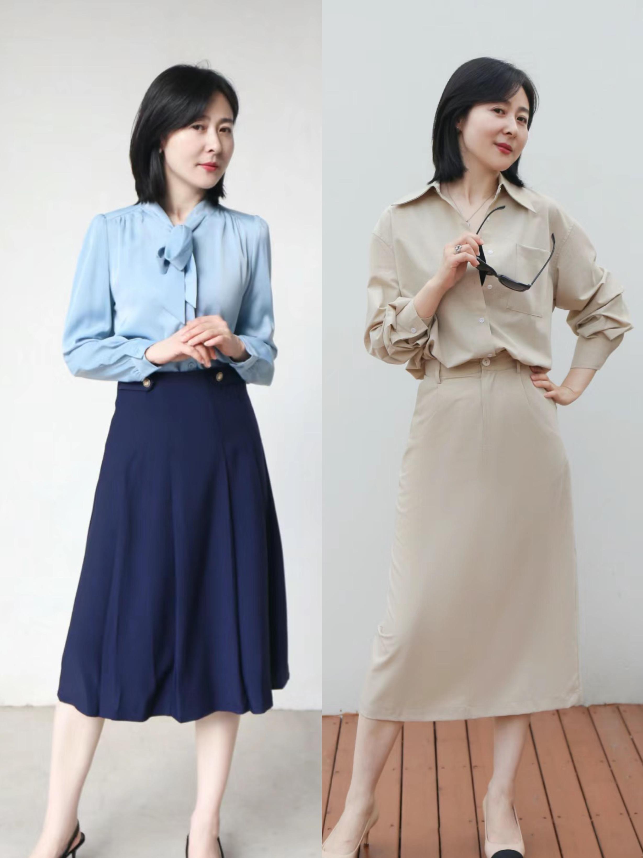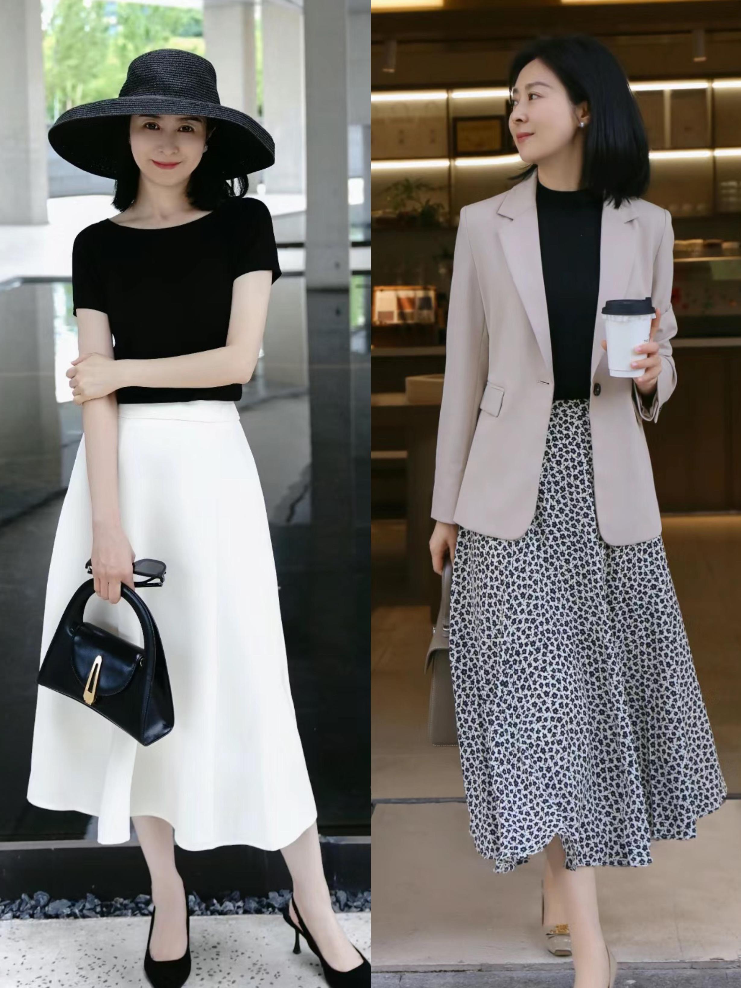 如果身材有一點發福、或者腰臀部肉感明顯的話,我們可以搭配高腰的A字形半身裙。同色系、或者同面料的搭配,都可以拉伸縱向比例,更顯高。