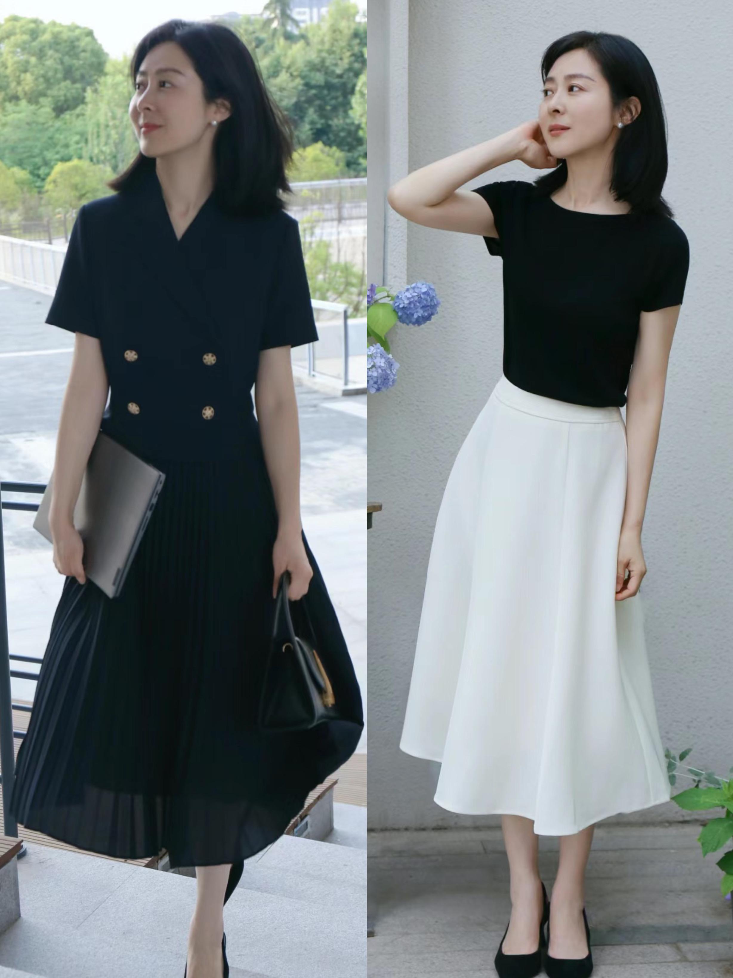簡約的連衣裙、或者半身裙,在夏天裏都是更具女人味的單品。想要凸顯氣質的話,就穿一身黑色西裝連衣裙吧。