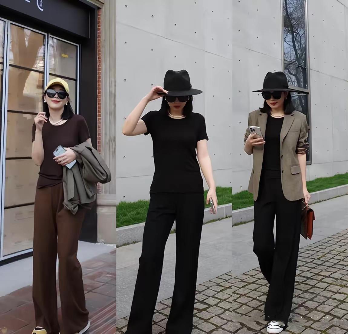 寬鬆且垂順的褲子,不僅可以修飾腿型不好、還可以拉伸縱向的比例,大方顯瘦的同時還顯腿長。